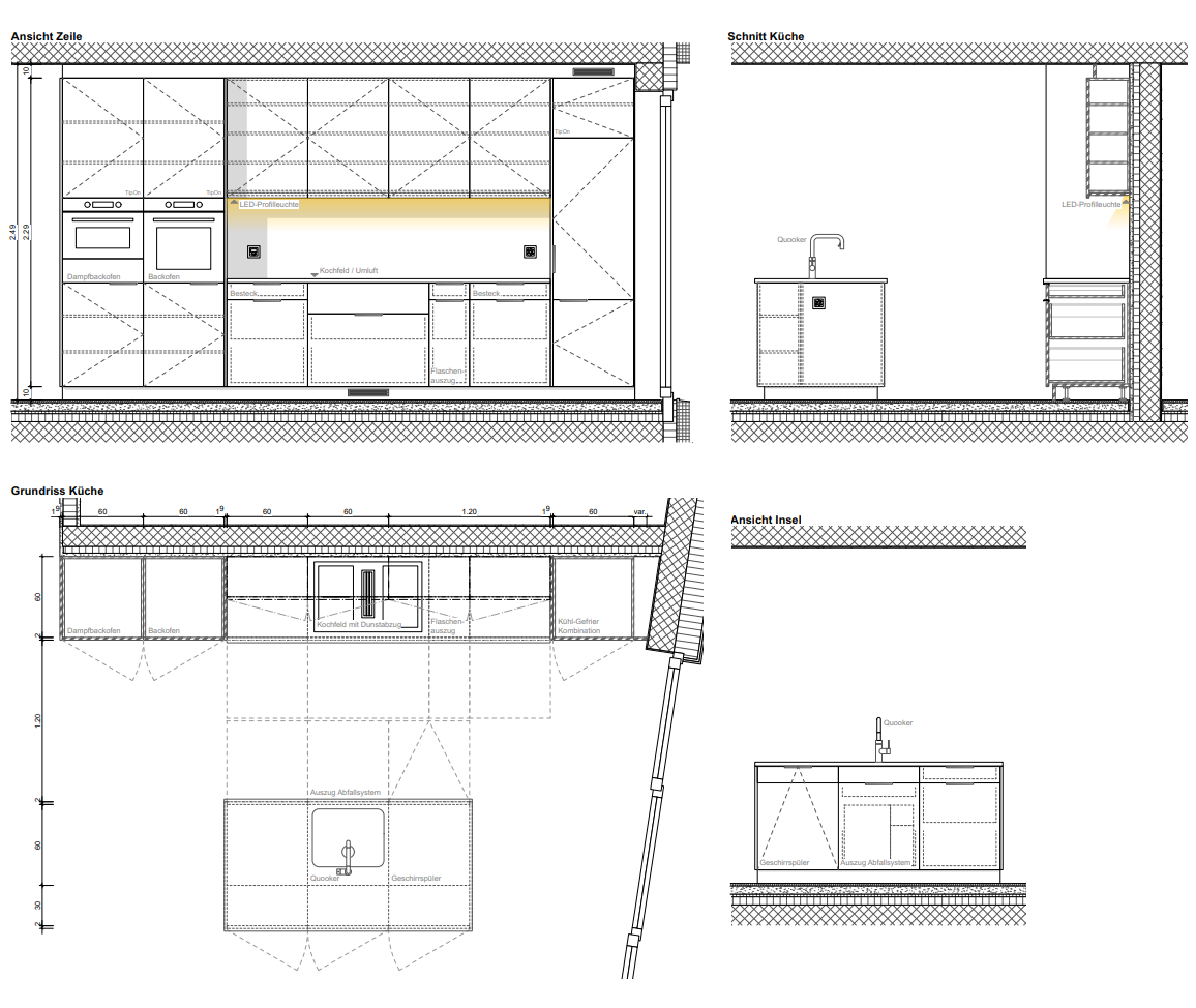 prompt a photorealistic 3d visualization of a modern kitchen layout based on a floor plan center view foreground a rectangular kitchen island with a dark 20mm ceramic worktop on the island there is a chrome quooker tap and a sink background a kitchen wall unit with floor to ceiling cabinets on both the far left and far right sides in the middle there is a countertop workspace with a satin glass backsplash appliances a miele induction cooktop with a built in vent is flush mounted in the back workspace a black miele oven and steam cooker are built into the tall cabinets style clean lines long stainless steel bar handles modern matte beige colors light wooden floor architectural lighting profile under the cabinets architecture