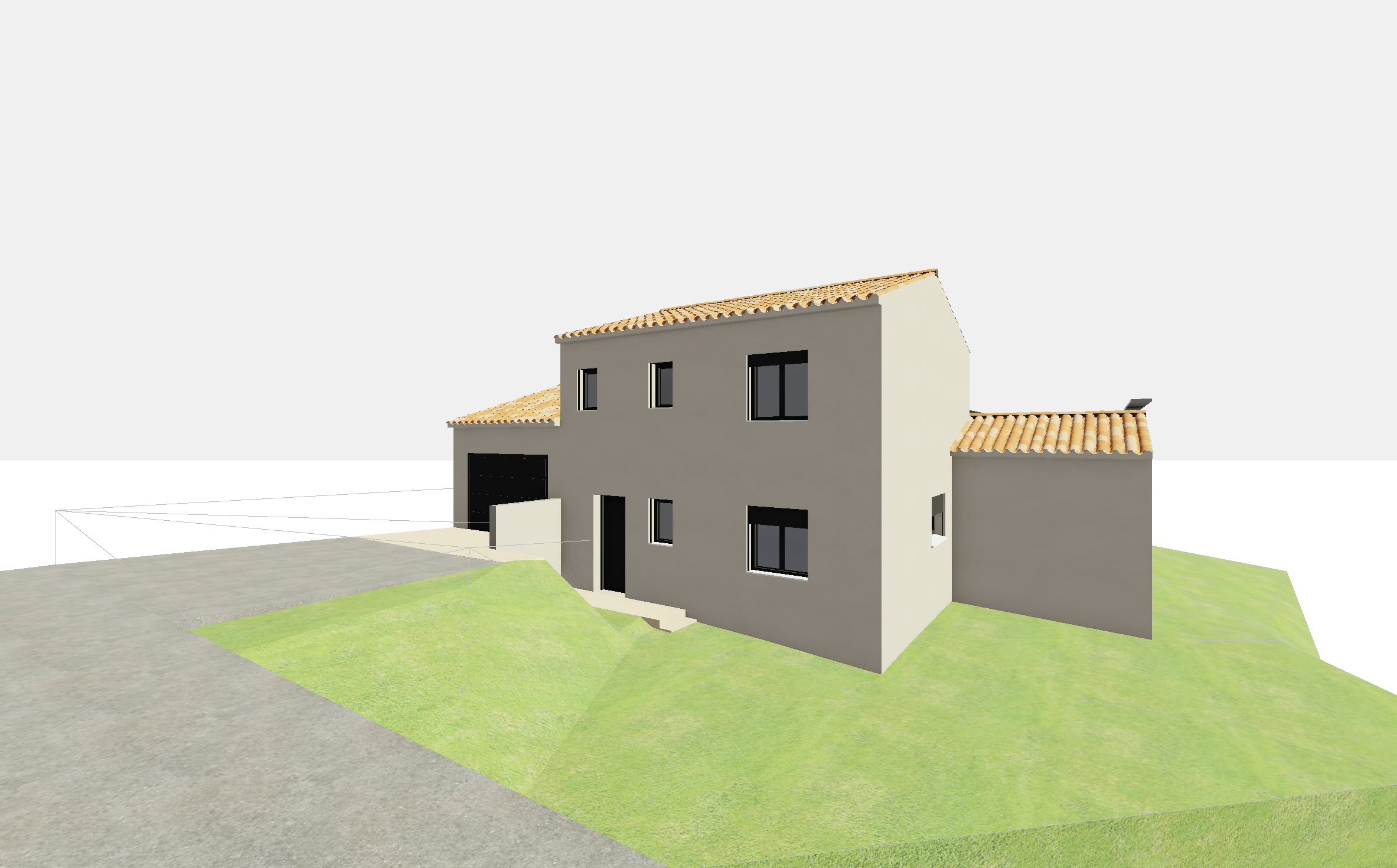 mediterranean pine trees and oak trees in the background the facade is color gibraltar from prb lot of sun light and trees shadows on the facade there are stairs in front of the main door