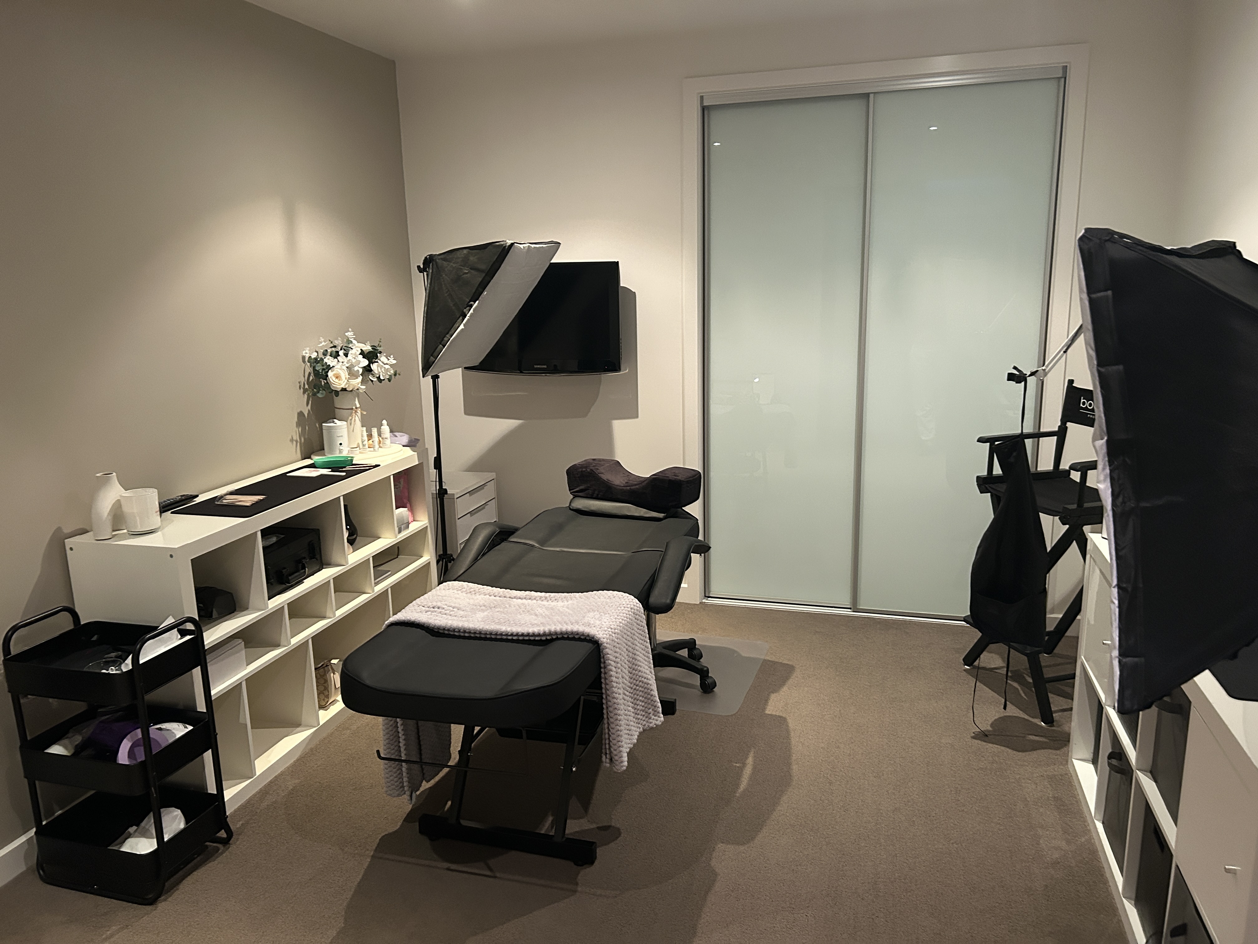 a neutral beauty room minimalist design soft lighting a modern vanity with mirror cozy seating