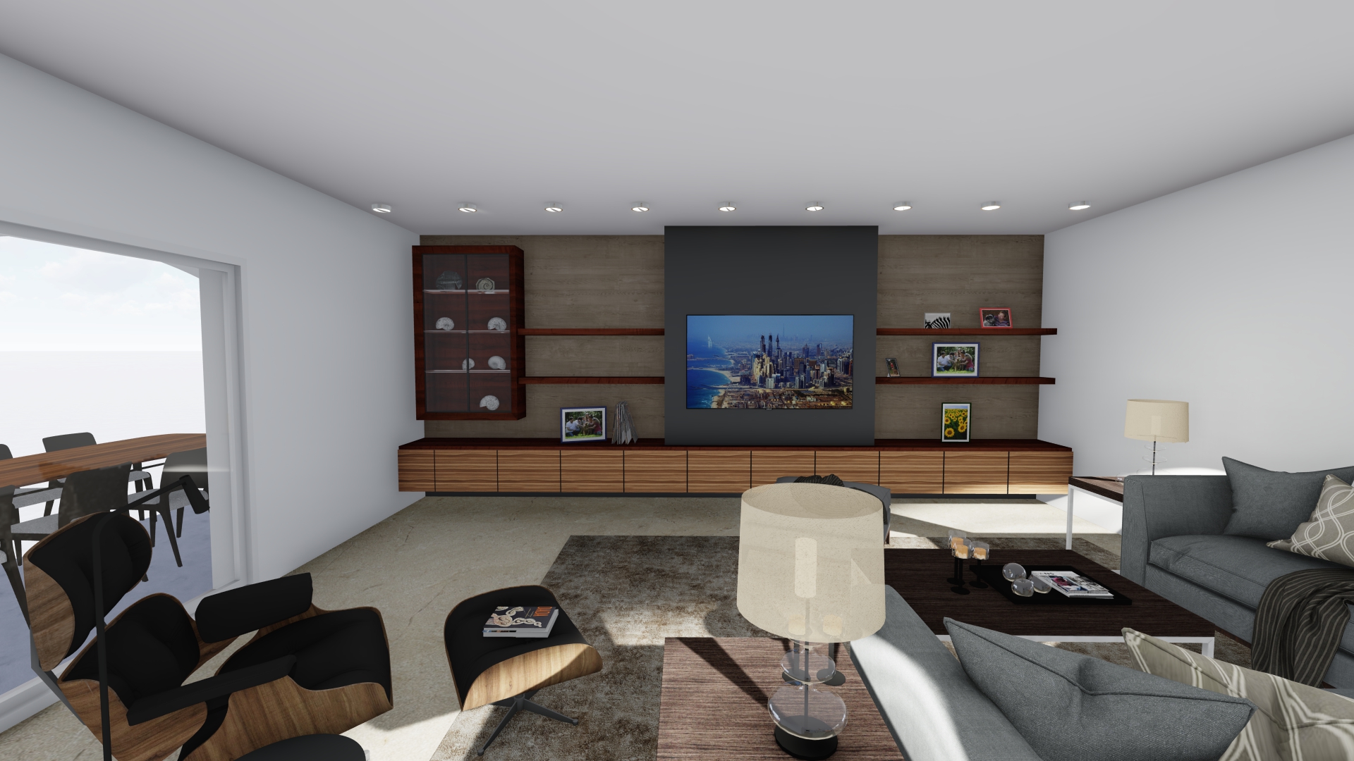 sobre esta ultima imagen generada quiero 1 los retratos de la estanterias m s grandes 2 que este todo el salon m s iluminado quiero los retratos mas grandes quiero los retratos mas grandes quiero tiras de led en la parte baja del mueble y tiras de led debajo de las estanterias quiero las lamparas iluminadas quiero que los circulos del techo sean focos puntuales sobre esta ultima imagen quiero los siguientes cambios 1 el ambiente exterior diurno 2 la pared del fondo papel pintado con aspecto de cemento quiero retratos mas grandes en las estanterias de tama o 30 cm x 40 cm en vertical quiero que la pared del fondo en las que se apoyan las estanterias este mas iluminada