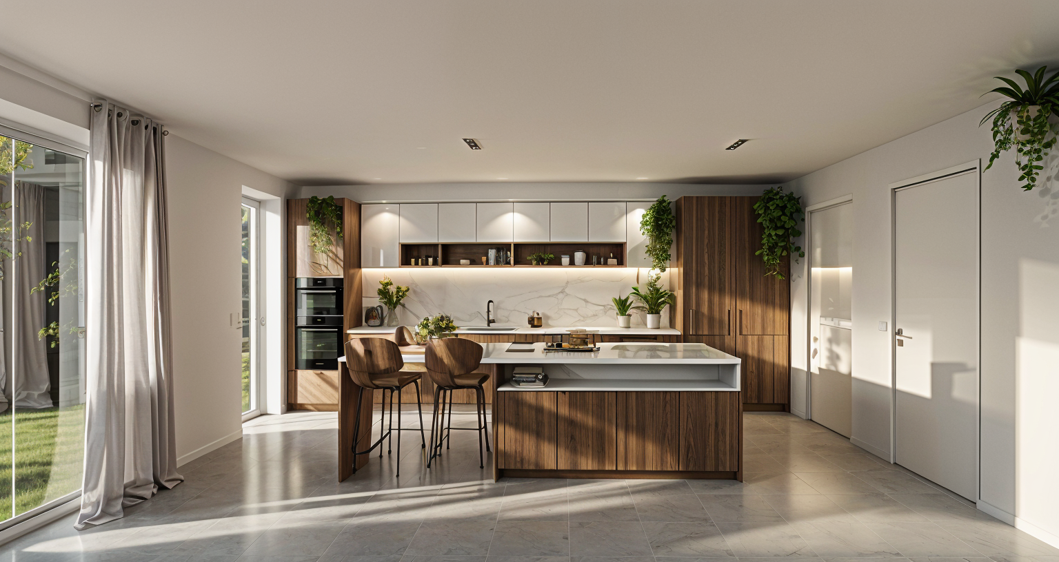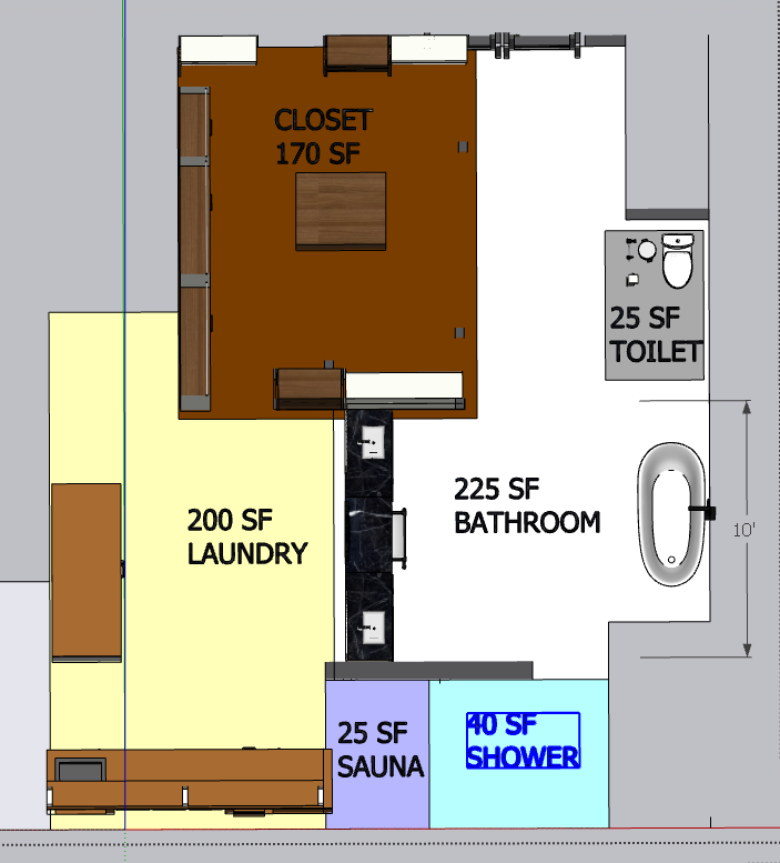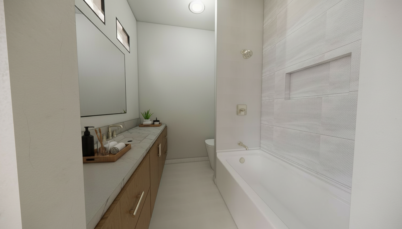 convert this floor plan into a realistic isometric 3d view of a full house show the space from an elevated angle with furniture walls and details visible rustic style with stone archway into the shower dark woods with bright cream floor and tiles to brighten big windows over the tub use the same furniture as shows on the plan do not change the orientation of the floorplan