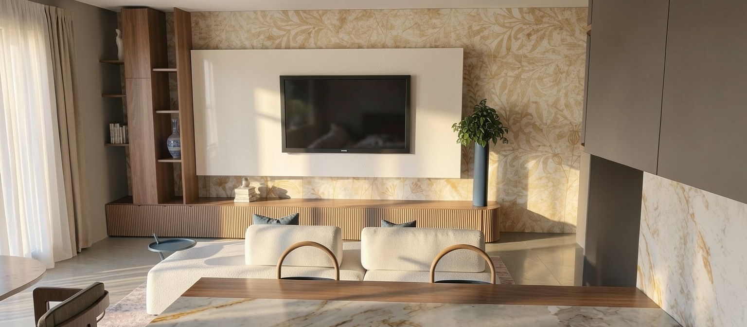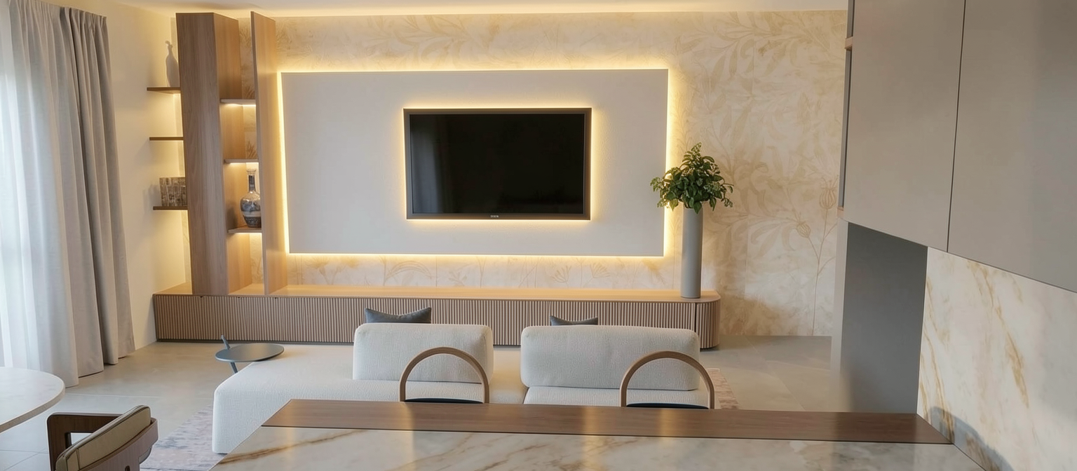 mantain everything make the wallpaper lighter add led light behind only the tv panel soft led light lighter wallpaper led light is not strong mantain the materials no light behind library