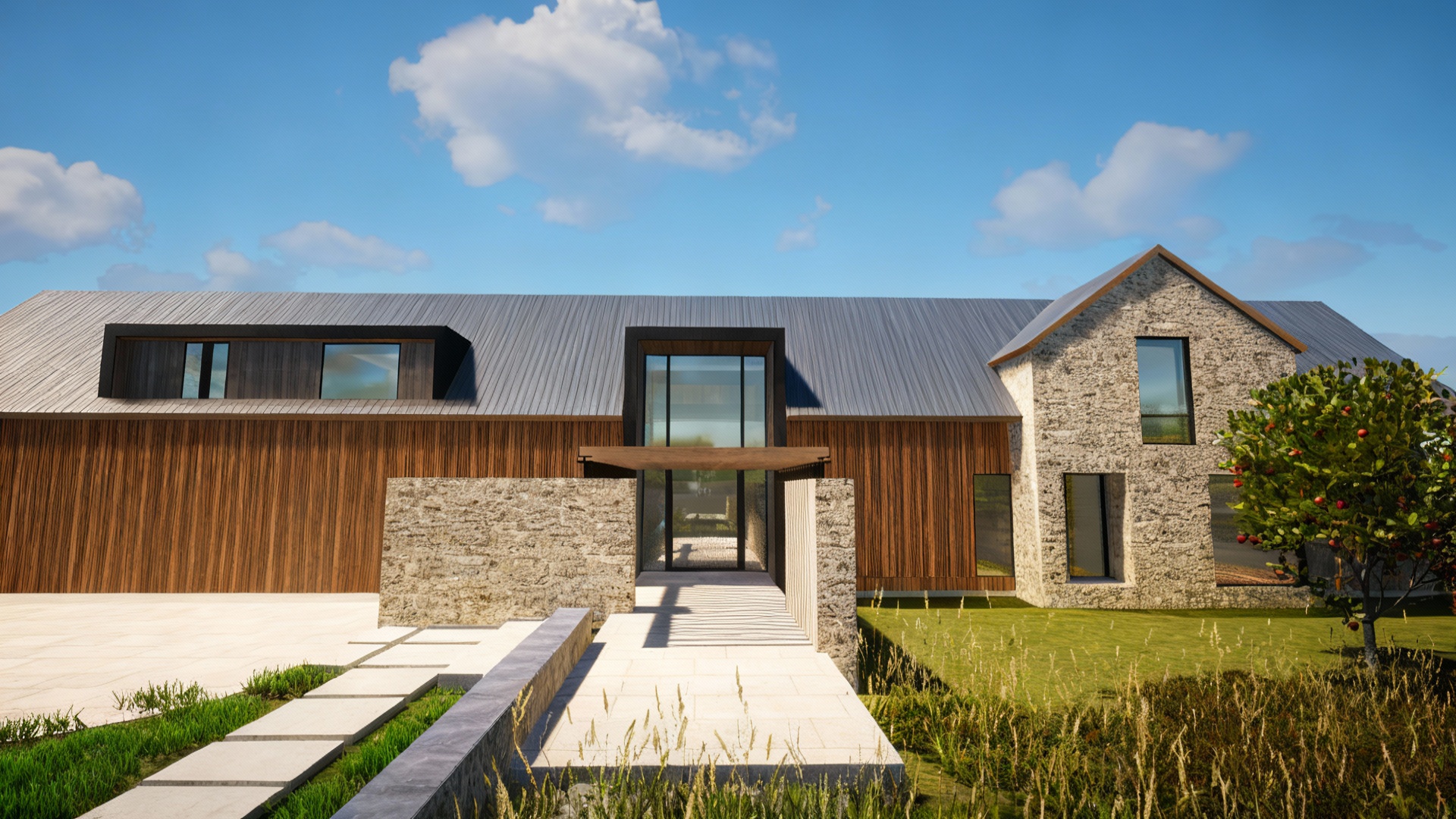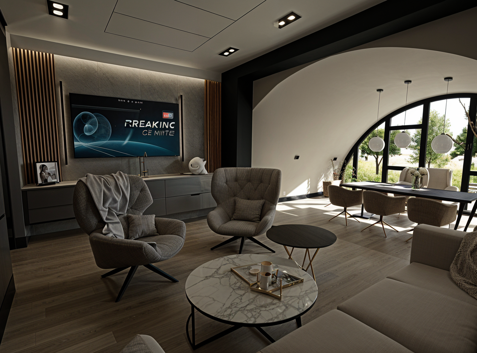 exterior shot render this image in a realistic style maintaining the exact same composition furnishings and design without adding or removing elements architecture