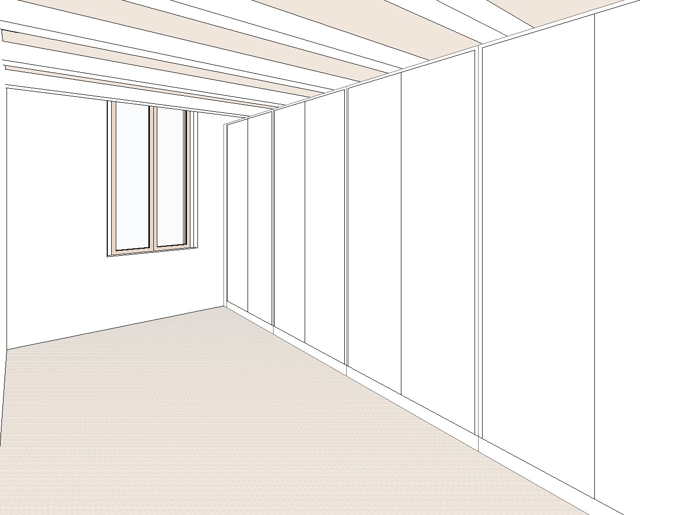 crea un render fotorealistico a partire da questa vista 3d non modificare le geometrie e una camera da letto in stile classico e moderno sulla sinistra sono presenti armadiature a muro con ante eleganti ma moderne sulla inistra posizione un letto morbido e moderno posiziona anche due comodini vicino al letto