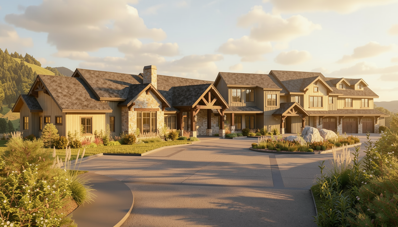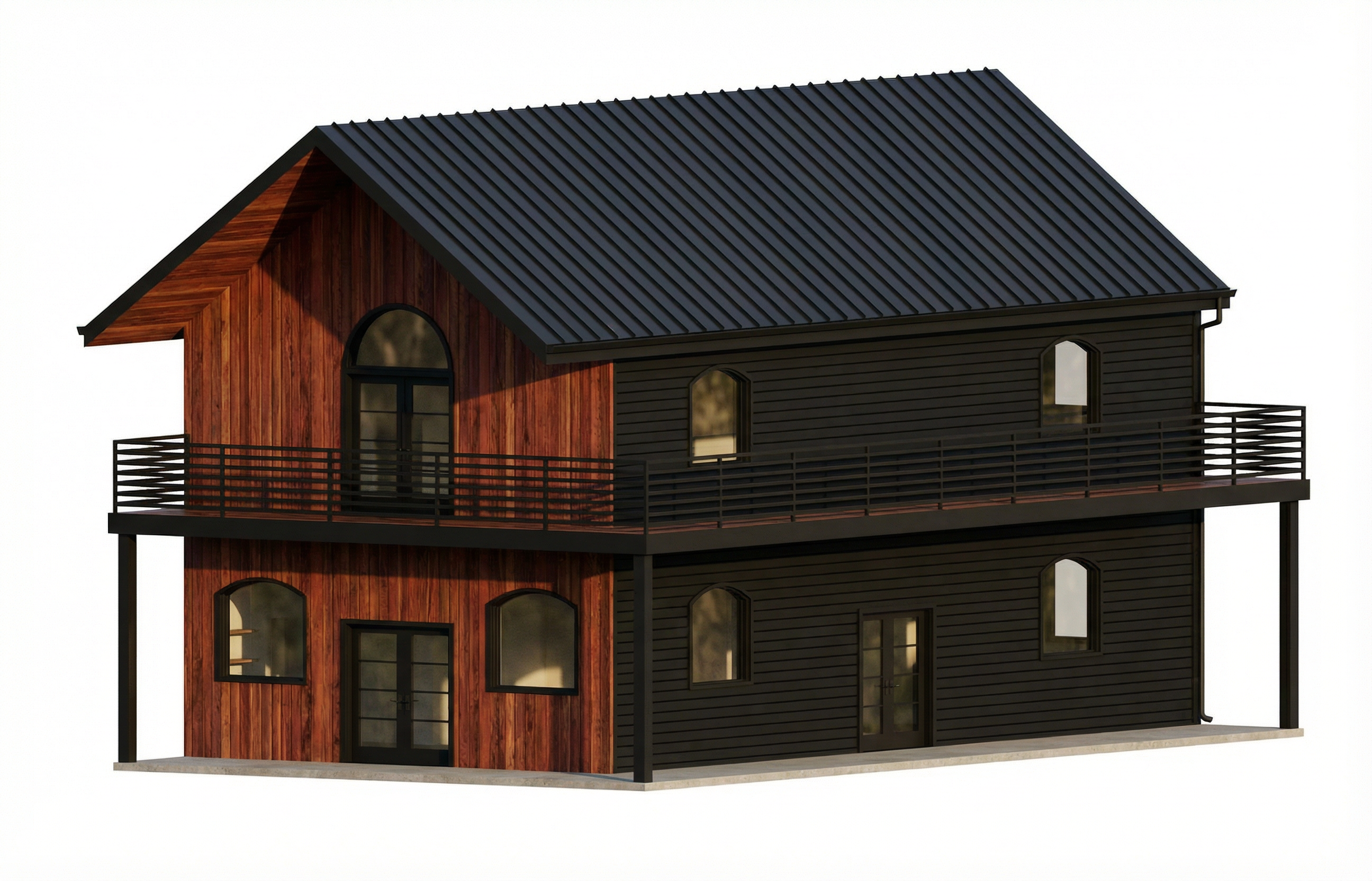 make into realistic home balcony and railing matte black roof black front dark red cedar vertical panels matte black metal horizontal panels on dark side palms and green grass landscaping