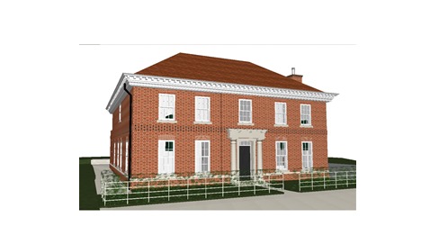 keep same angle of image generate a hyper realistic visual of this exact house the house is red brick with back brick on edge detailing the dentals and white soffit and fascia as per the drawing the windows also white make the fence a black post and rail fence with a cream resin bound front driveway the planting is to look semi rural but manicured with some wild planting in the central grassed area make the image aspriational and classy and dont change design or proportions keep same view the house on the left is flint with brick detailing