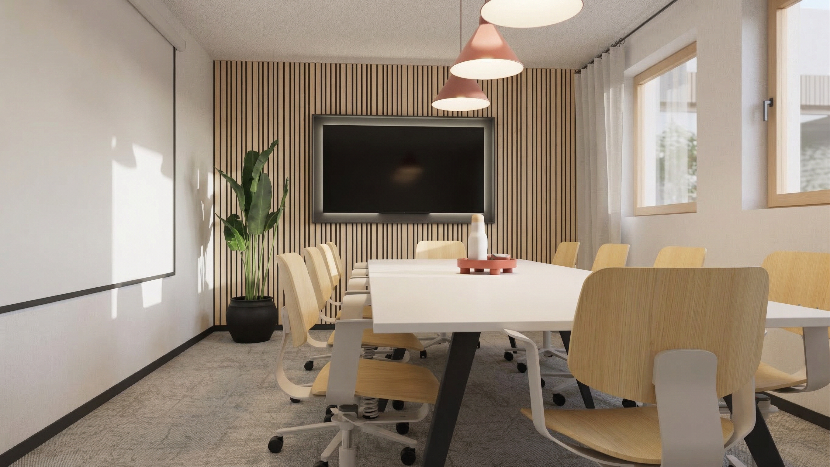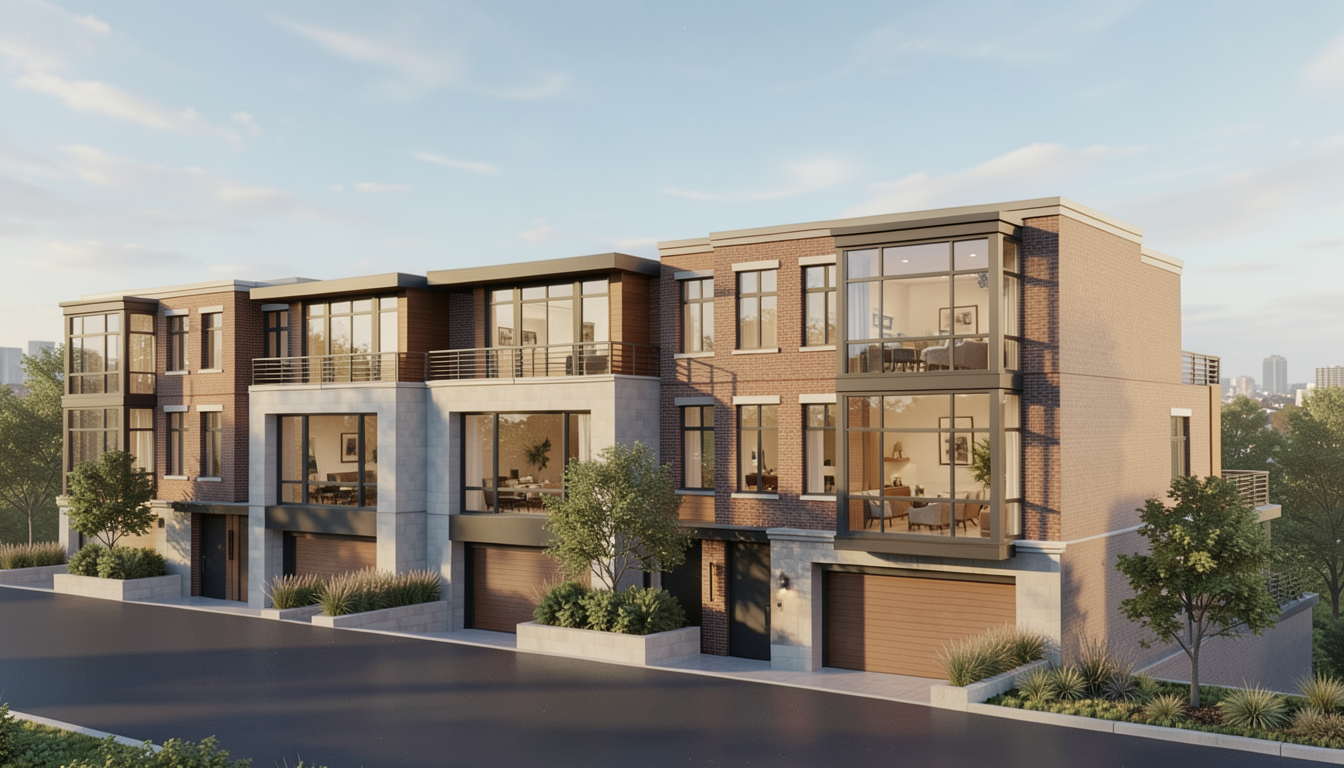 ultra photorealistic architectural rendering in a cinematic real time visualization style unreal engine d5 render quality late morning daylight with slightly angled sun creating soft defined shadows balanced exposure with no blown highlights low bloom and controlled dynamic range warm neutral color grading with subtle warm highlights and neutral shadows no blue tint natural material response with warm light reflecting off wood and ground surfaces slight contrast boost with clean crisp edges and subtle ambient occlusion clear atmosphere with no fog or haze but natural depth created through slight background softening and contrast falloff foreground and main subject remain sharp and detailed minimal curated landscaping with natural but slightly desaturated greenery no overgrown vegetation cinematic composition realistic sky with soft blue tones and light clouds professional architectural visualization style sharp focus 8k resolution lit and fully furnished interiors behind windows road with driveways to garages in foreground black brick with wood and stone materials building built into hill building on top of hill view of city of cincinnati ohio in the background with trees