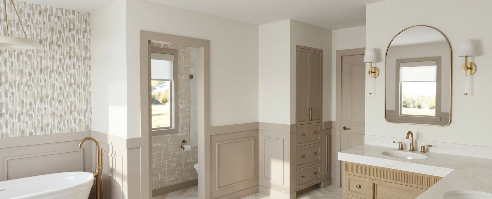 modernist exterior shot scene show the carriage house from the side emphasizing its connection to the main house and the surrounding garden use the soft diffused light of early morning to create a peaceful and serene atmosphere architecture focus on the interplay of different materials the smooth finish of rendered concrete walls contrasts with the rough texture of natural stone accents large sliding glass doors open onto a private patio extending the living space outdoors landscaping showcase a multi layered garden with a variety of textures and colors hydrangeas lavender and hostas provide vibrant pops of color against the neutral background a meandering gravel path leads to a secluded seating area under a pergola aesthetics embrace a minimalist aesthetic with clean lines and simple forms the color palette should be muted and calming pale greys soft greens and natural wood tones architecture