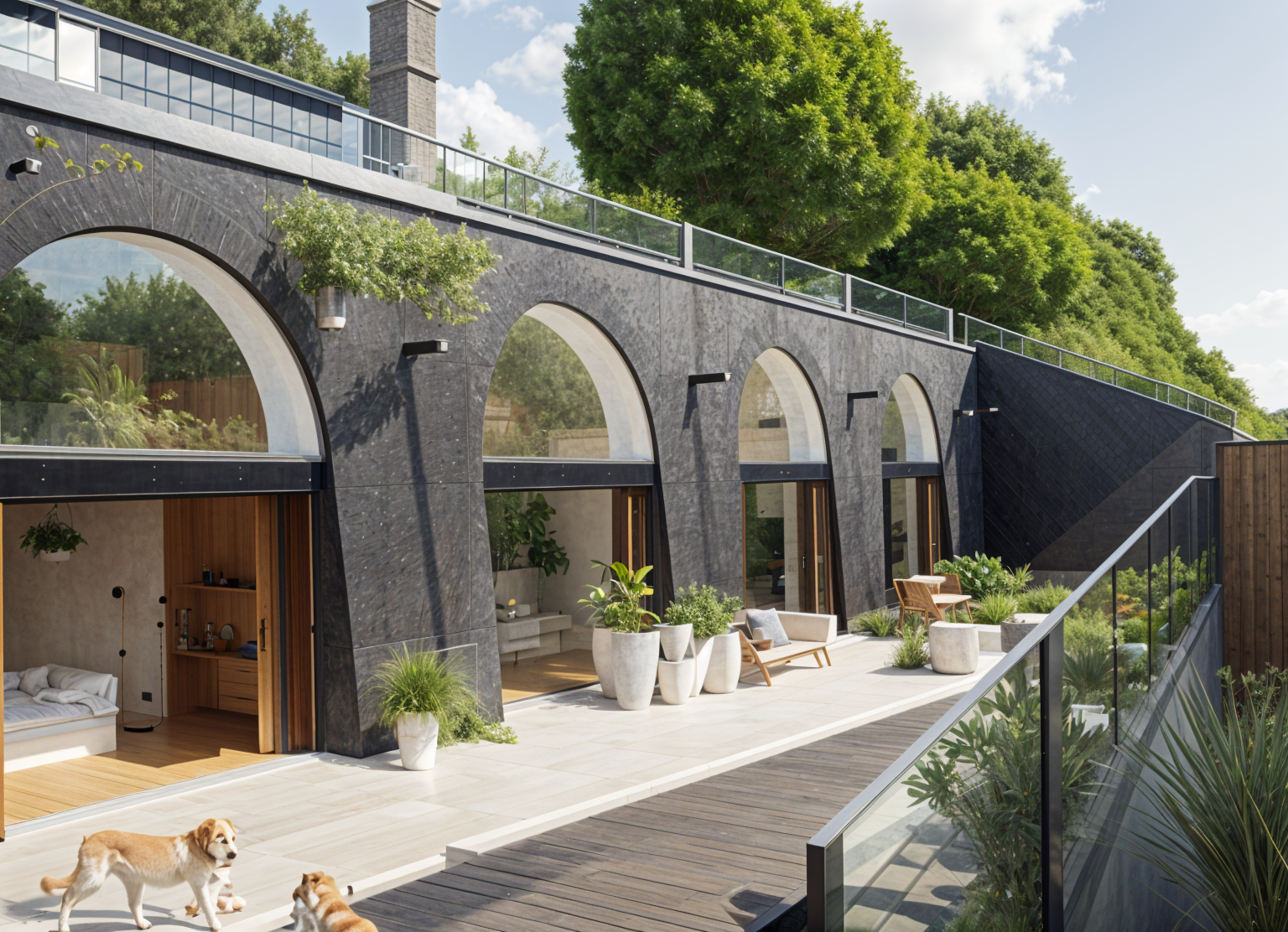 modern exterior shot exterior of a rustic stone building with arched windows surrounded by smooth brick walls the canopy is a light airy white fabric casting gentle shadows the outdoor seating area features sleek white chairs and tables complementing the stone lush green plants in modern white pots add vitality the atmosphere is serene and elegant with soft diffused daylight creating a sophisticated ambiance architecture