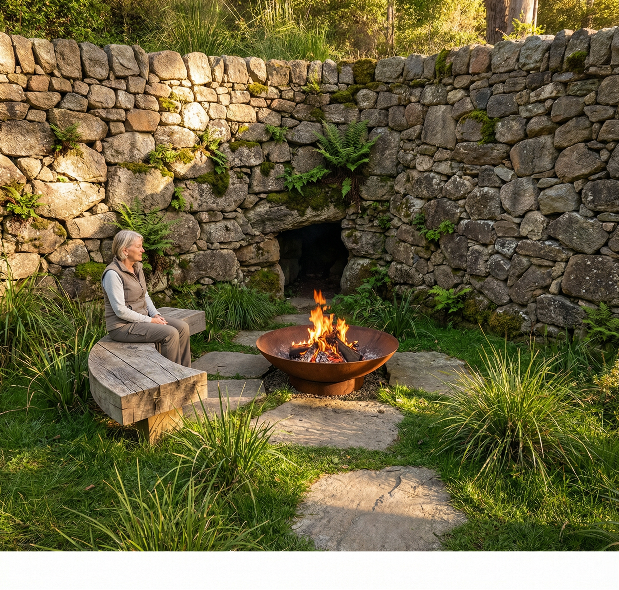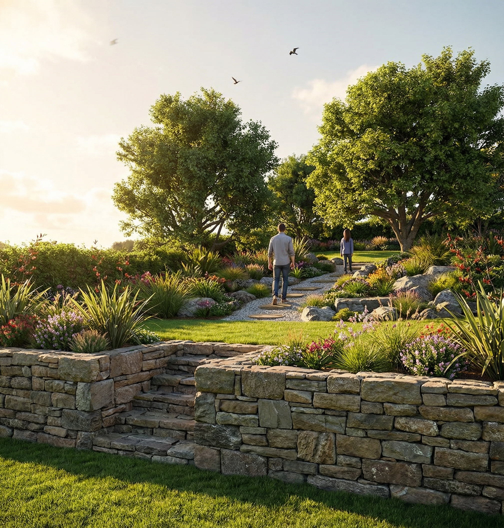 middel section is lawn above wall flowering and nz native plants lawn on front of stone wall stone steps go up the back slope
