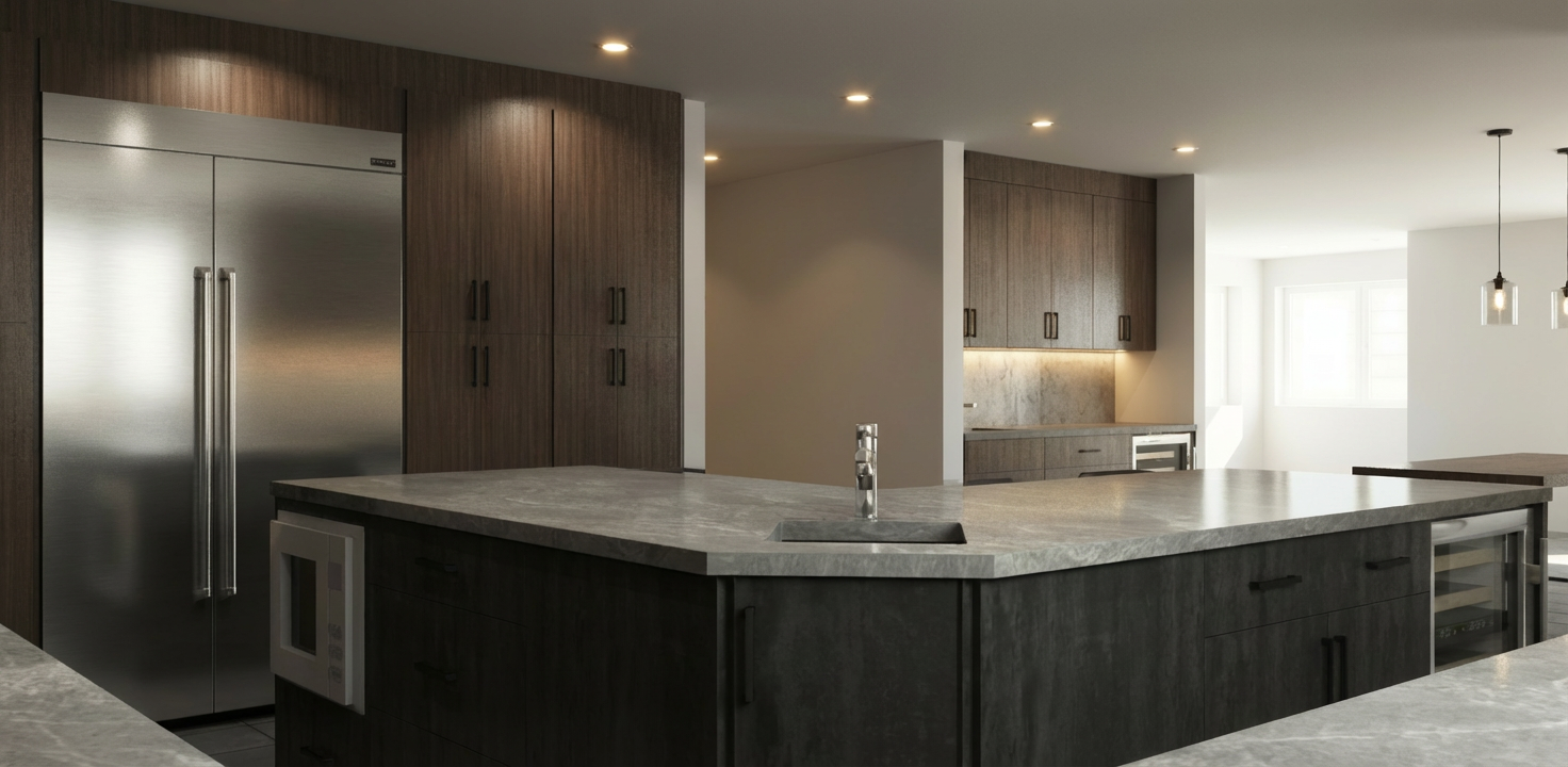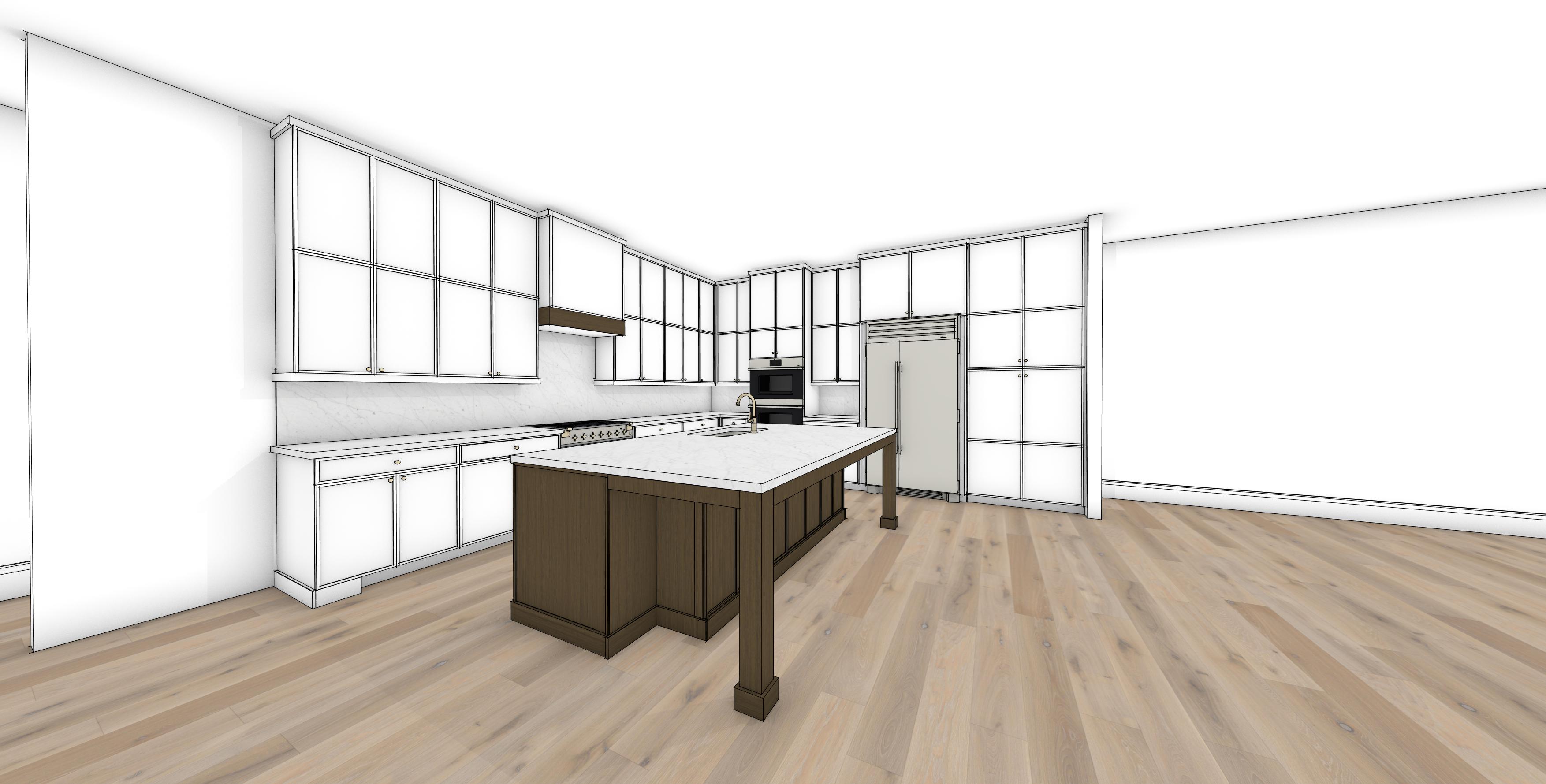 a modern luxurious kitchen with an open concept design walls in a soft creamy beige tone cabinets are sleek white with elegant gold handles a white marble countertop with subtle gray veining the backsplash is a polished marble finish complementing the countertops the stove and range hood are stainless steel adding a modern touch the flooring is warm light oak wood providing a cozy contrast gentle natural lighting fills the space creating a serene and welcoming environment atmosphere bright elegant and inviting