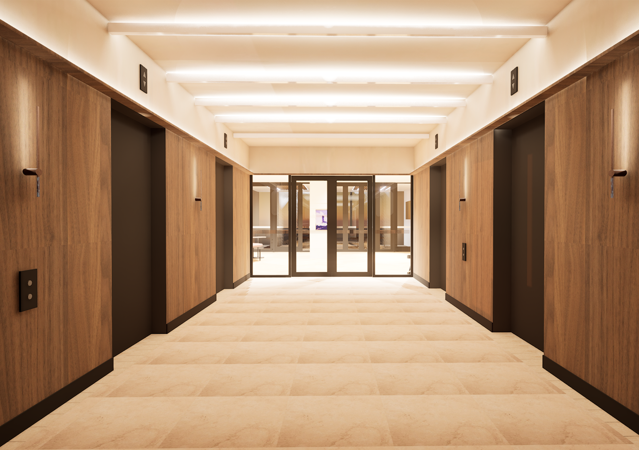 this is an interior render of a lift lobby area in an office workplace do not make any adjustments or changes to the existing scene including materials equipment furniture objects lighting etc unless specified by the prompt make the led light glow on the ceiling battens less intense make it a realistic image