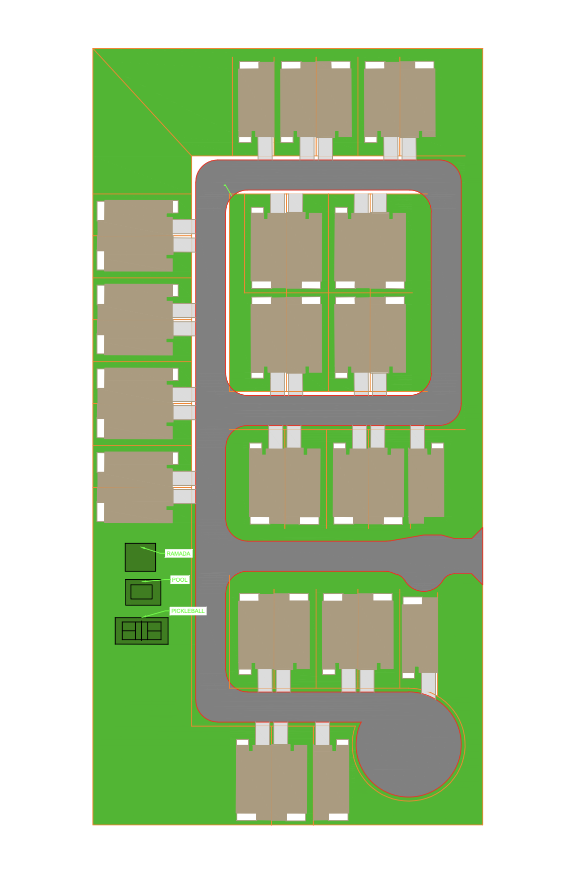 do not add any text to this plan make the tan parts look like houses add landcaping