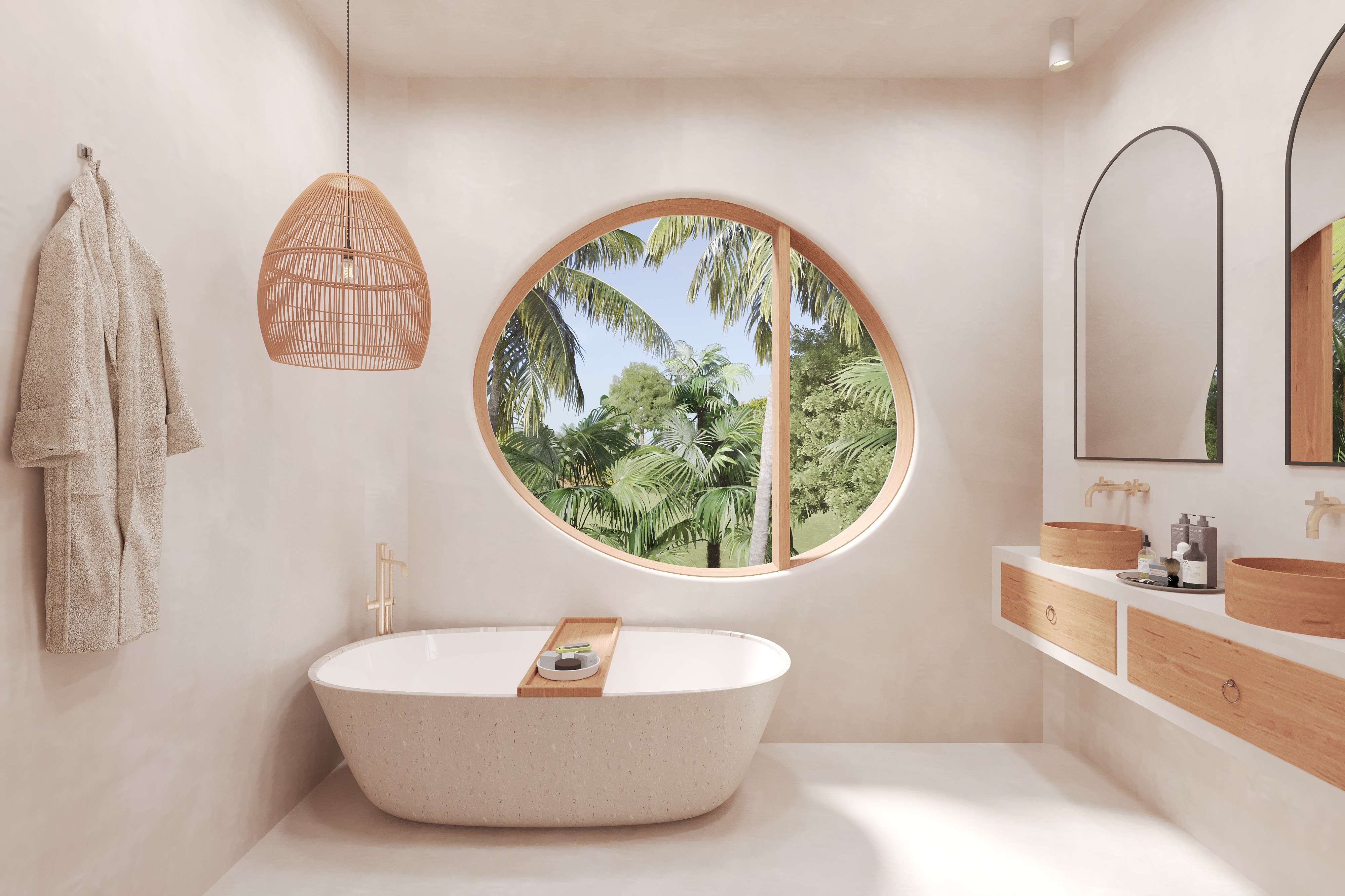 editorial architecture photograph of a bathroom in a bali villa improve materials and mood natural lighting sharp details