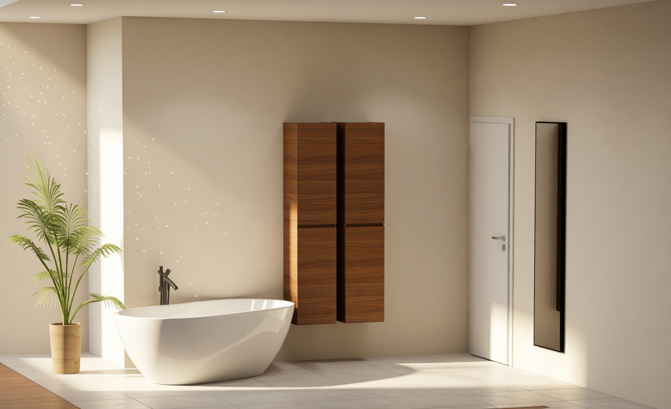 we want a japandi style bathroom make the finishes and lighting luxurious