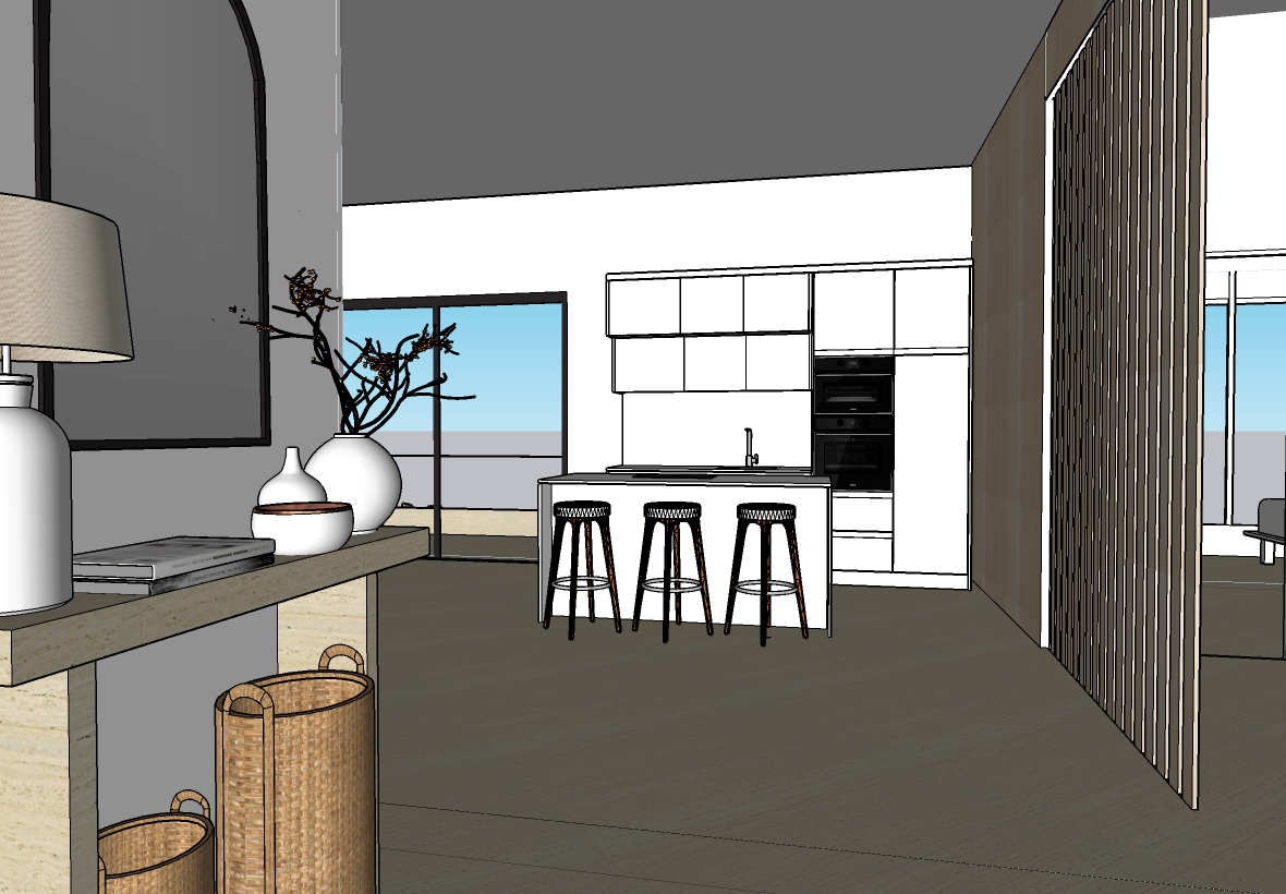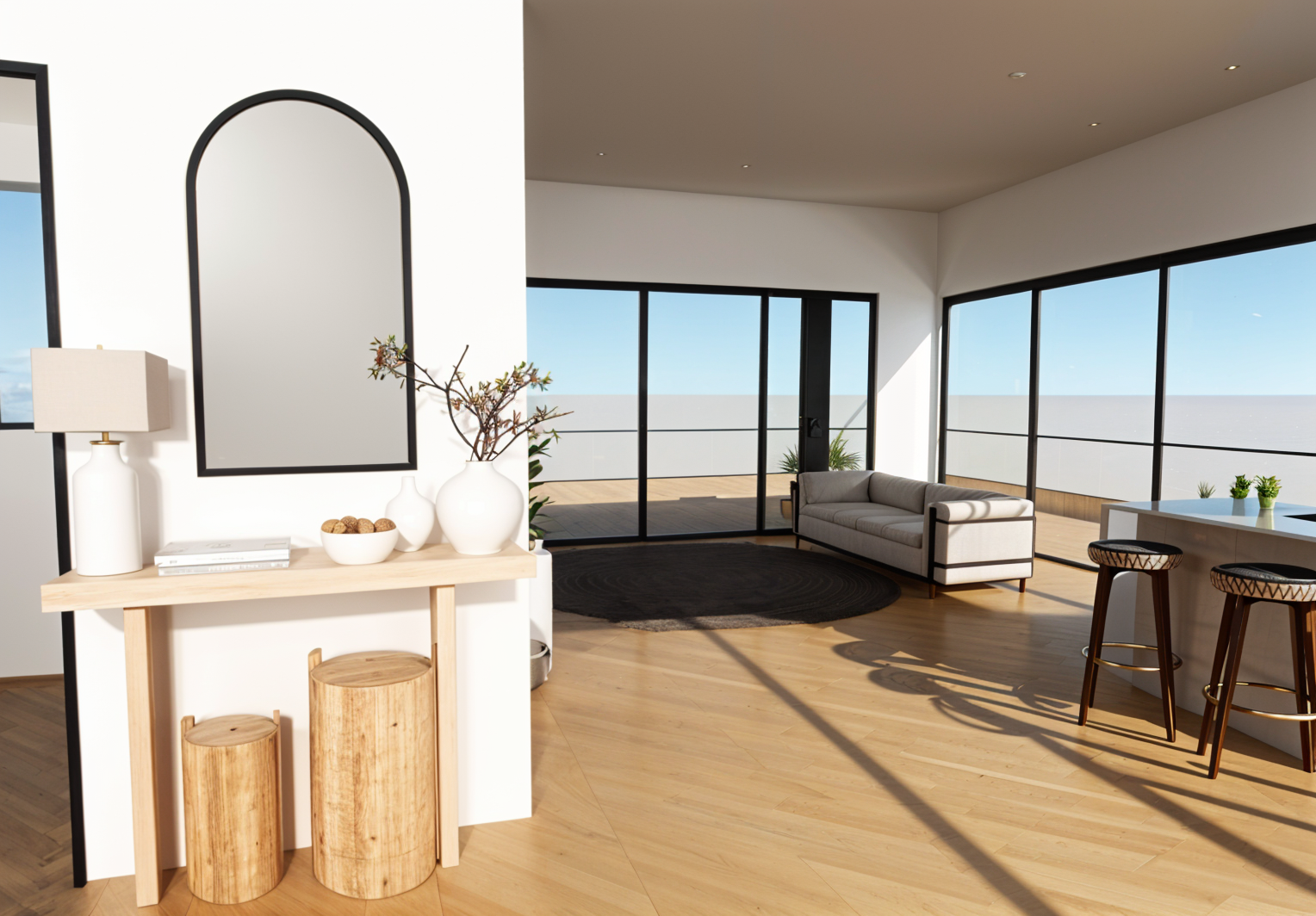 exterior shot a beautifully rendered modern kitchen interior with a serene and cozy atmosphere the walls are crisp white the floor has a light oak wood texture the minimalist kitchen cabinets are pure white with a glossy finish the bar stools feature a dark wooden base with beige cushions the console table is a light natural wood complementing the woven basket underneath the table lamp has a soft beige shade and the vases are matte white and soft terracotta a blue sky and ocean view on the horizon is visible through the window bringing in natural light overall the ambiance is modern inviting and harmonious with neutral and warm tones