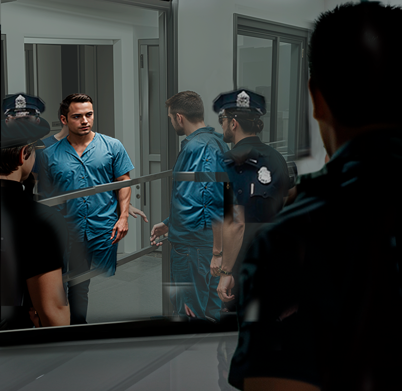 put a blue prison inmate suit on the man standing at attention with his arms at his sides