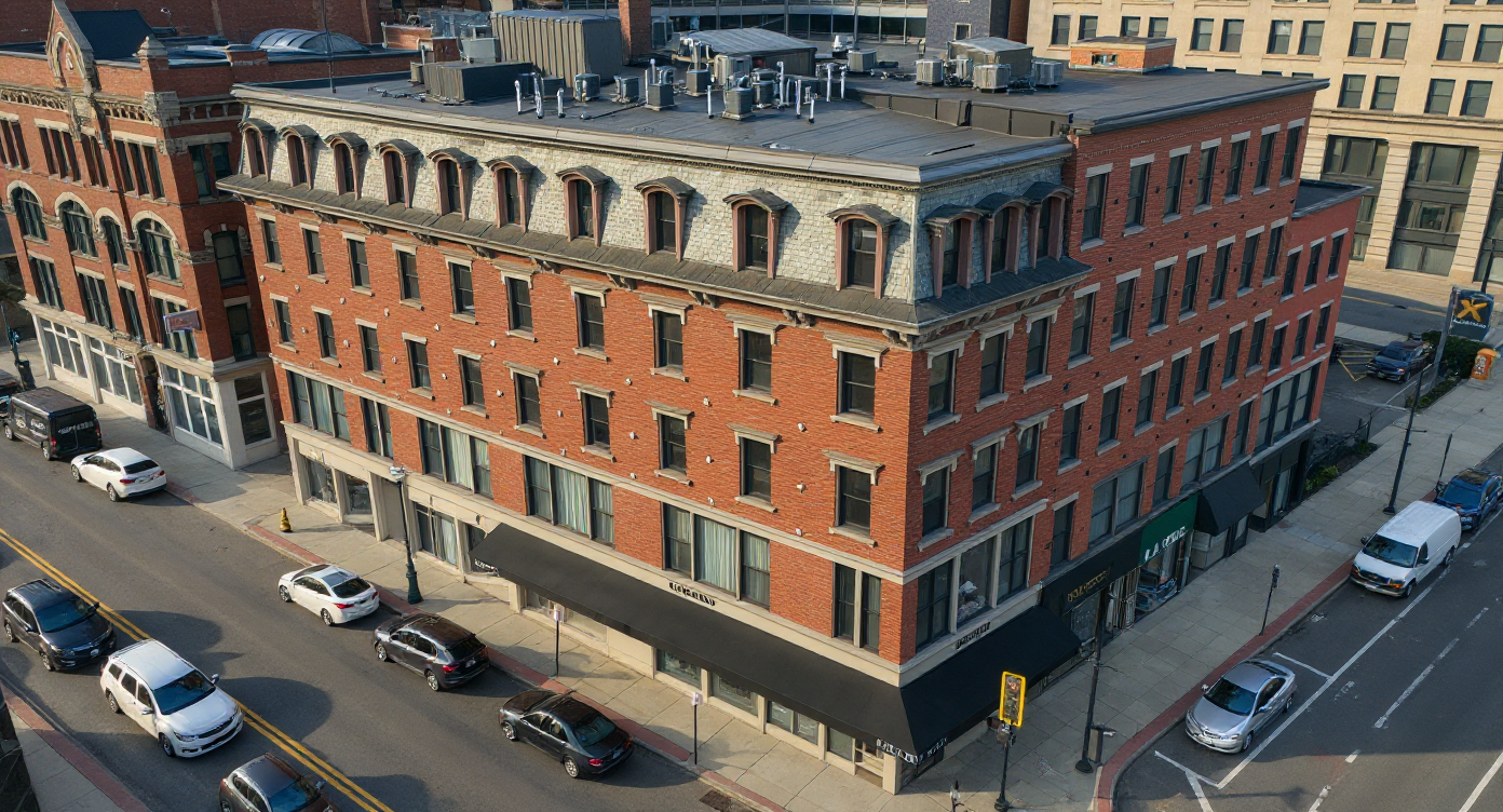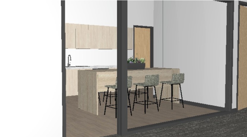 render image keeping all colors and finishes and architecture the same make photo realistic make ceiling 2x4 office grid with lights do not change architecture keep stools green