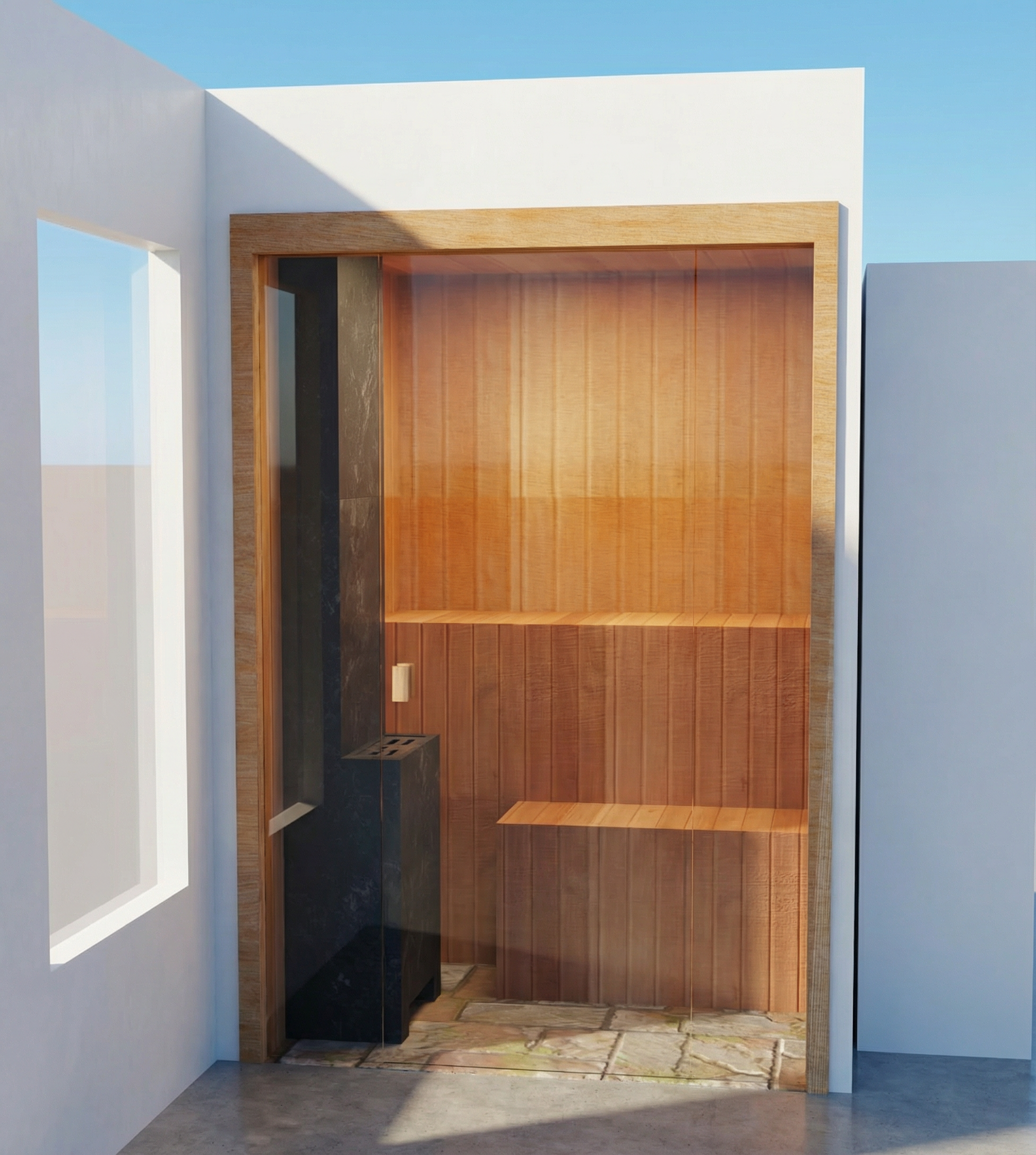 black pvc cladding with a pcv stone effect like the phots windows and door be be black with clear glass black roof and sofit black put the backround in a garden