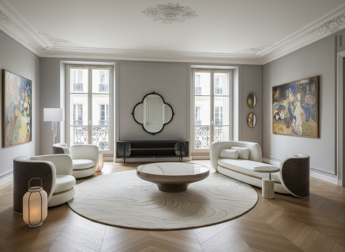 bring furnitures closer to carpet to create a circular layout remove two small wall mirrors show both coffee tables