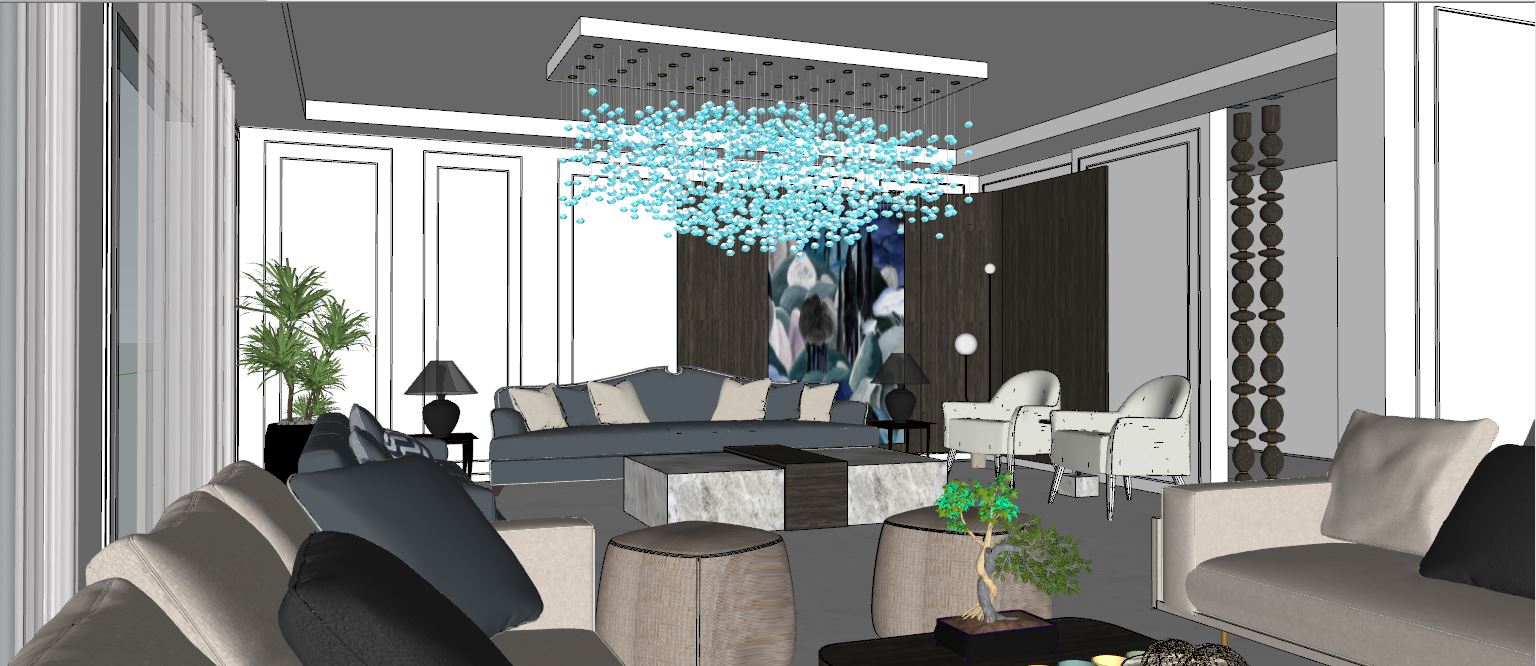 keep colors same as in the picture and make fabrics looks real the floor tiles are white marble add effect of indirect light to ceiling daylight from the left of the picture add light effect to lamps chandelier is crystals blue and transparent add light to the chandelier also keep wood same color and chandelier crystal white not blue