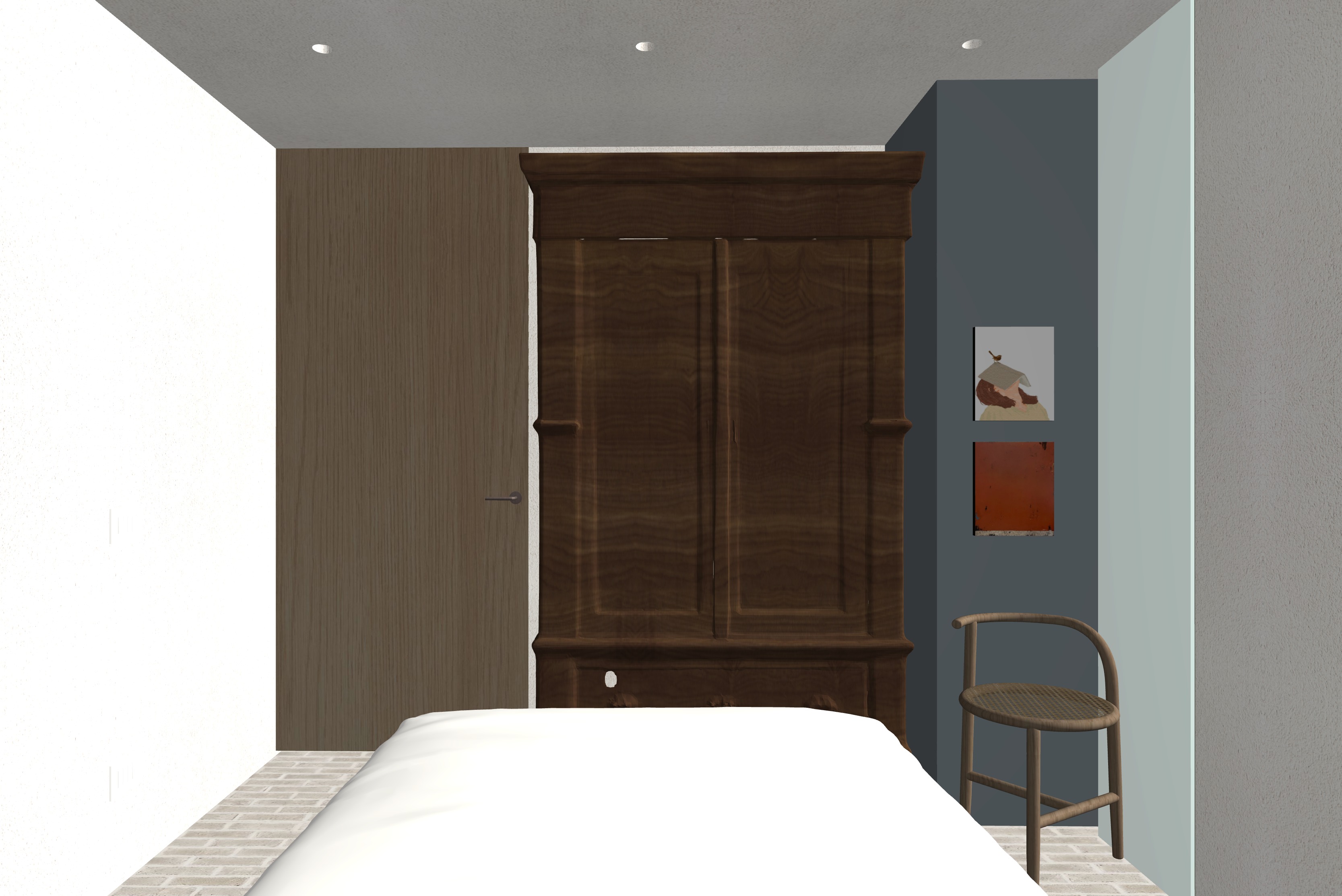 mantieni texture immagine pavimento come texture immagine muro come intonaco esterno bianco accendi faretti a soffitto aggiungi due cuscini decorativi azzurro polvere aggiungi dei libri sulla sedia mantieni parte del muro azzurro polvere come immagine il rettangolo verticale azzurro accanto al muro verniciato azzurro polvere uno specchio mantieni texture porta
