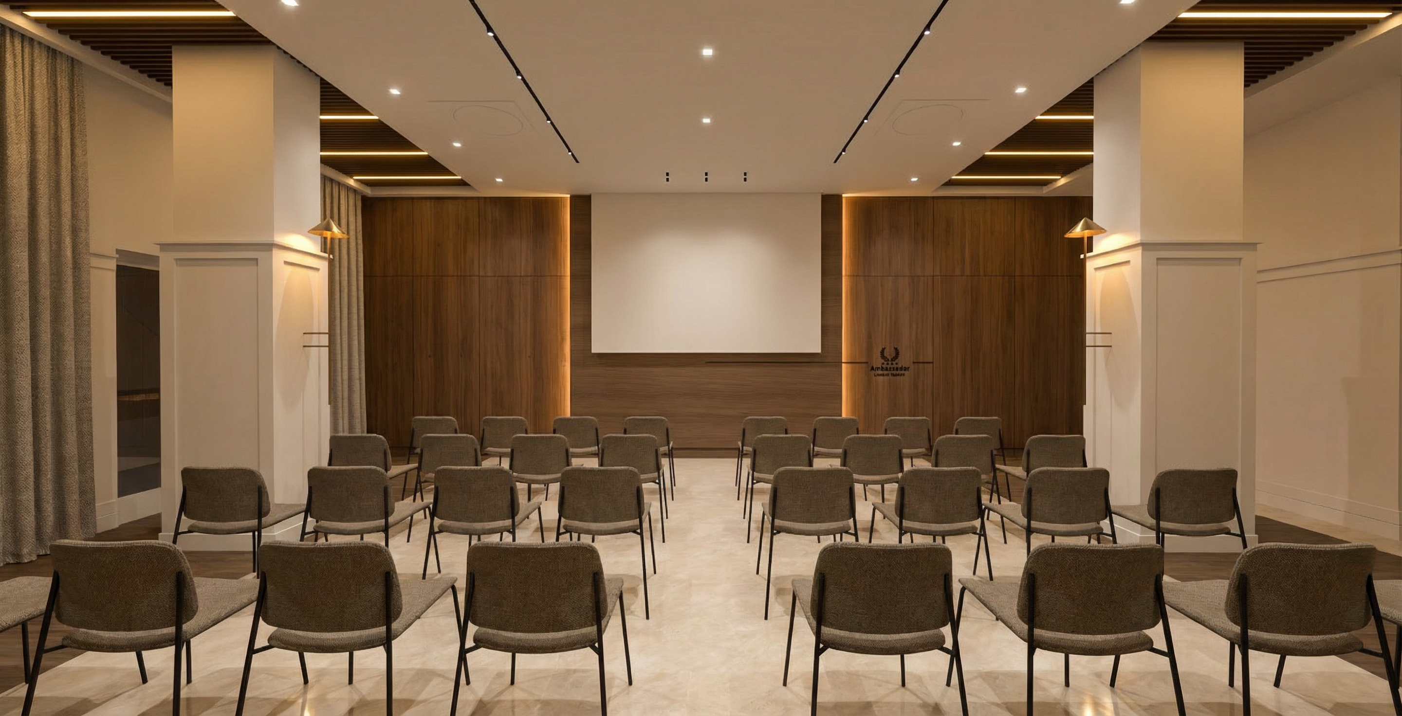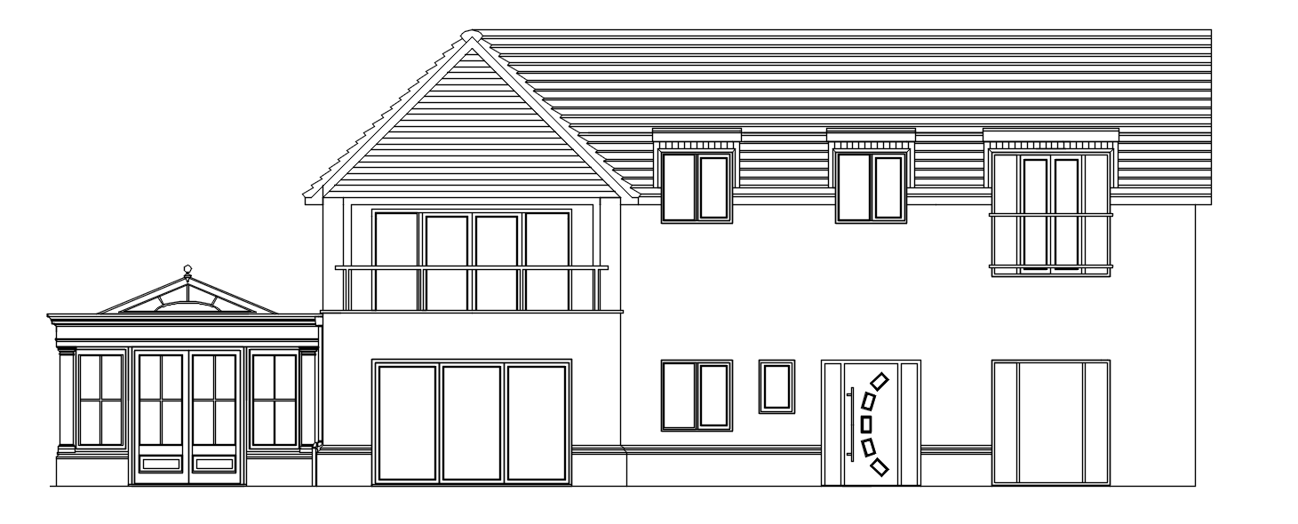 starting from the ground up green grass in foreground with a grey sandstone patio in front of the property the left hand side is a grass area there are no neighbouring properties the brick up to the plinth is red brick with the top two course blue brick the render is white and the roof tiles are grey the windows and doors in the property are anthracite grey the gable of the house has horizontal cedar paneling with a grey steel goal post frame and a stainless steel balustrade with glazing to form a balcony the french doors on the right hand side first floor elevation feature a juliet balcony with stainless steel balustrade and glass the house guttering is black the orangery extension to the left hand side is a timber orangery finished in grey anthracite to match the house windows the lantern roof features a decorative gable above the front elevation which sits on top of the entablature
