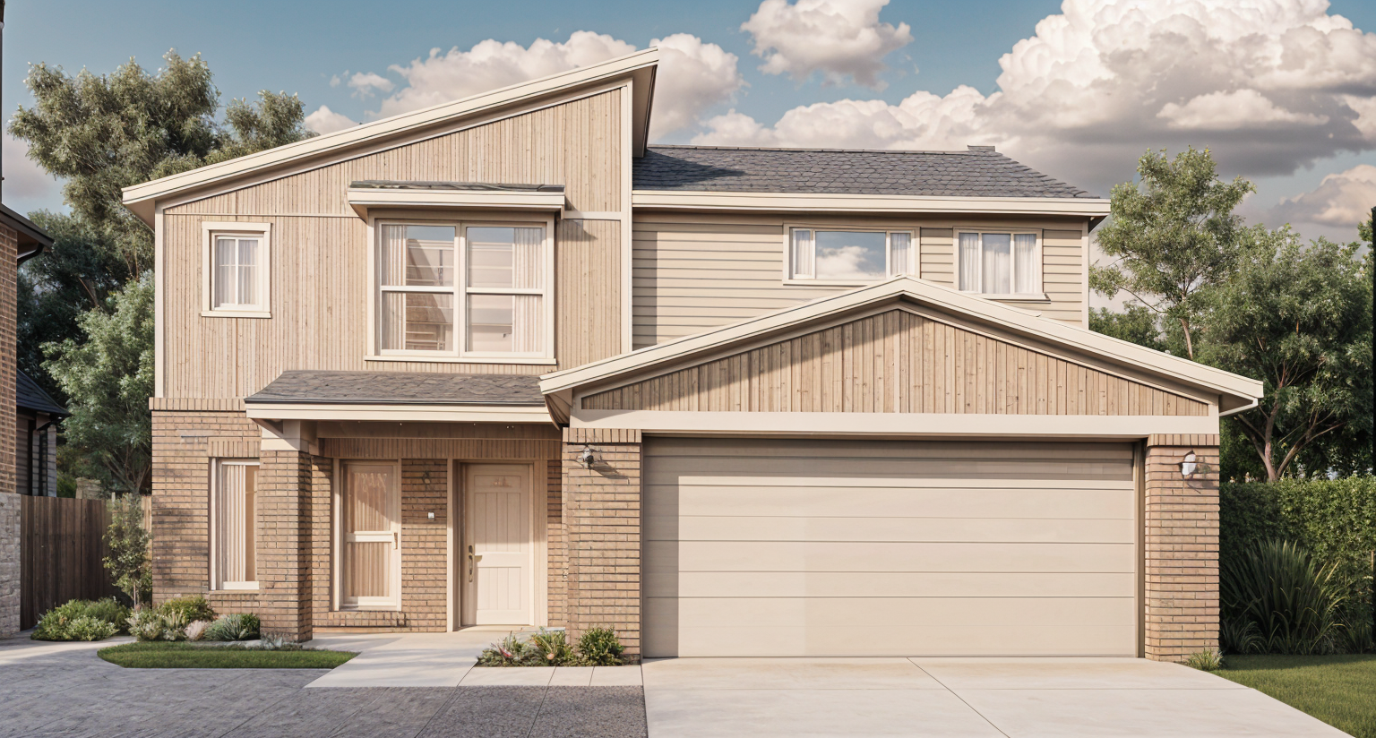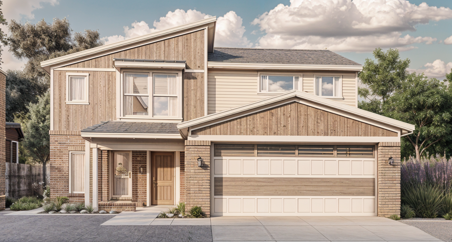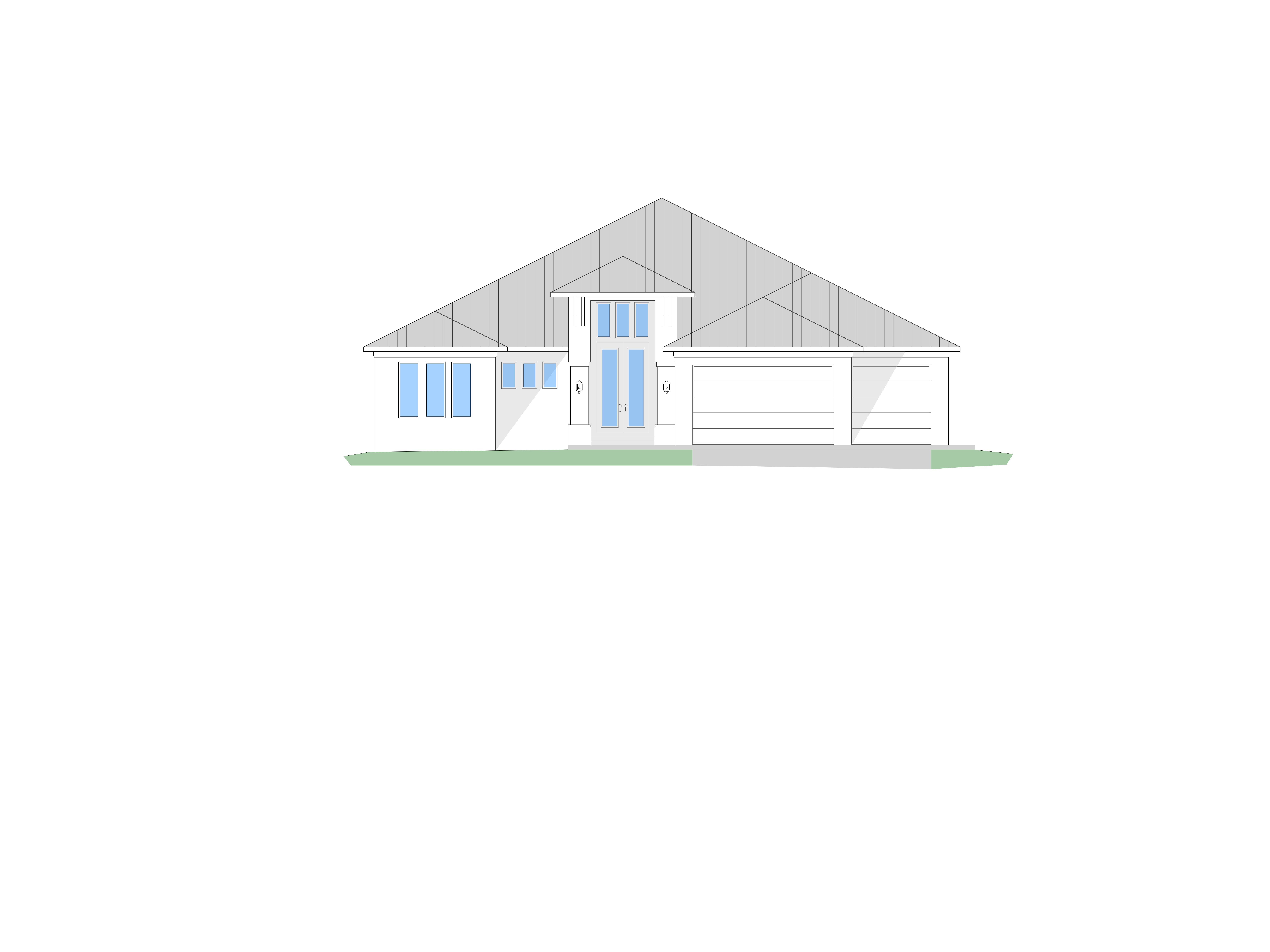 show a light grey standing seam metal roof show the entry corbels as dark grey show the banding as dark grey the house should be smooth finish stucco and painted white dark grey dappled paver sidewalk from entry doors sweeping to the garage garage doors are simple modern style tropical landscape with blue sky and fair weather clouds