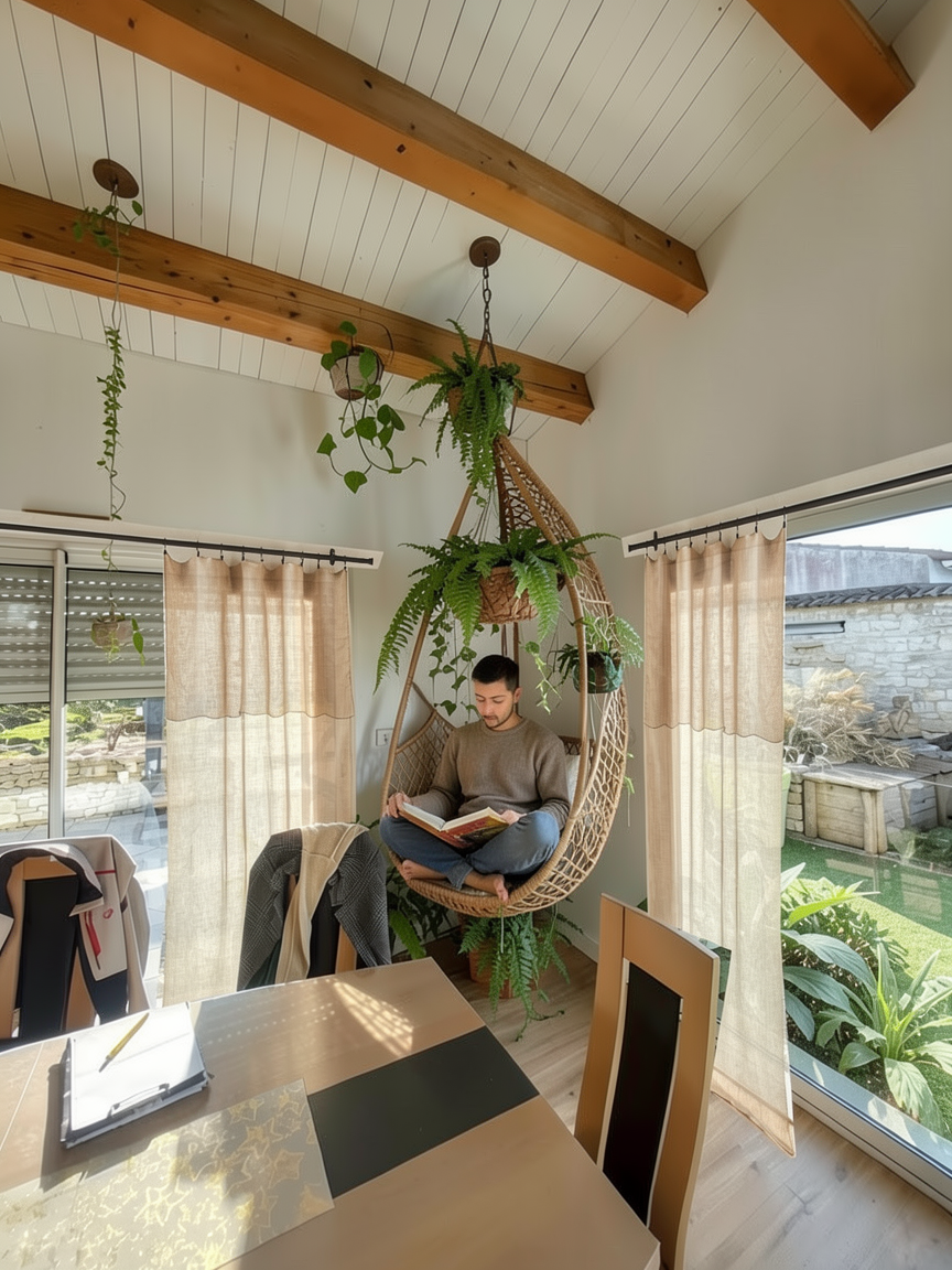 create a cozy modern bedroom scene with a minimalist design feature a soft gray textured wall on the right and a wooden floor with warm brown tones include a bed with a light gray comforter and decorative pillows both with subtle geometric patterns add wooden cabinets above the bed and a matching wooden desk with integrated shelves to the right place a small round ottoman with a white cushion and wooden base in front of the desk incorporate a window with a subtle blue sky outside enhancing natural light set a soothing and calm atmosphere with soft diffused lighting throughout the room add some books and decoration on shelves on the left side of the bed there is a mirror dimmed antique style from ceiling to floor add books snad lights led on shelves mirror is in antique style do mot add eniything in the right corner