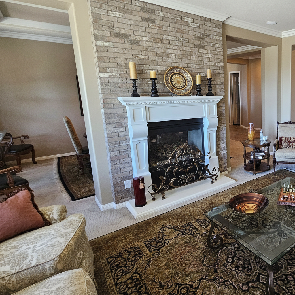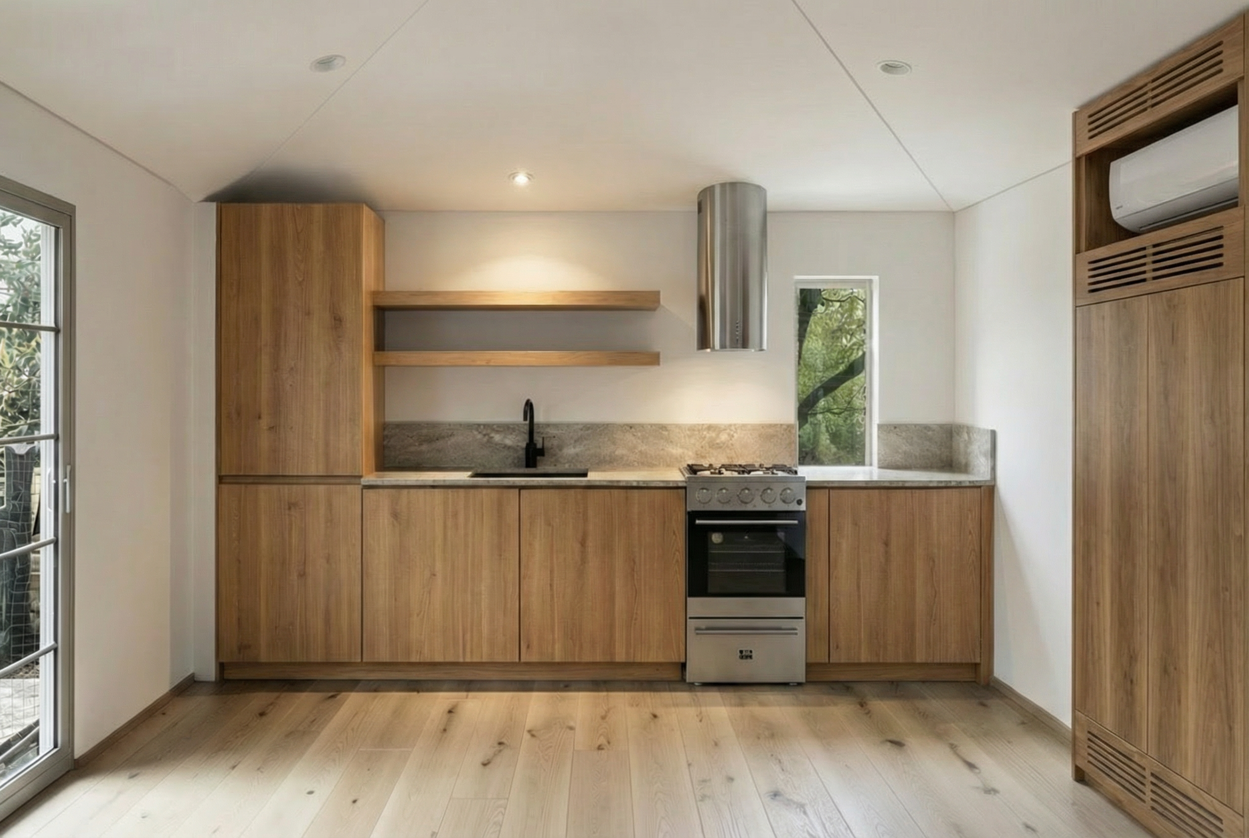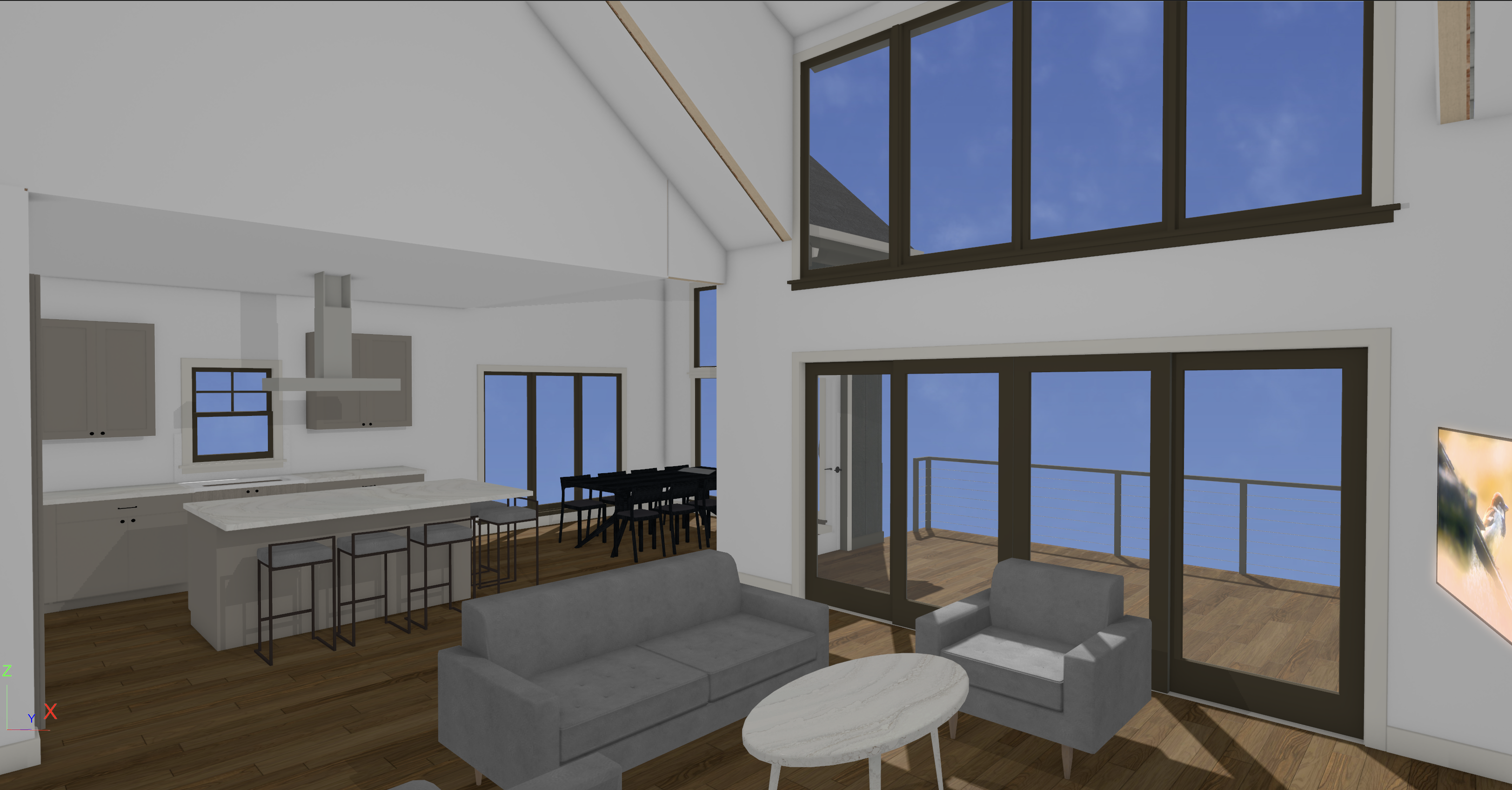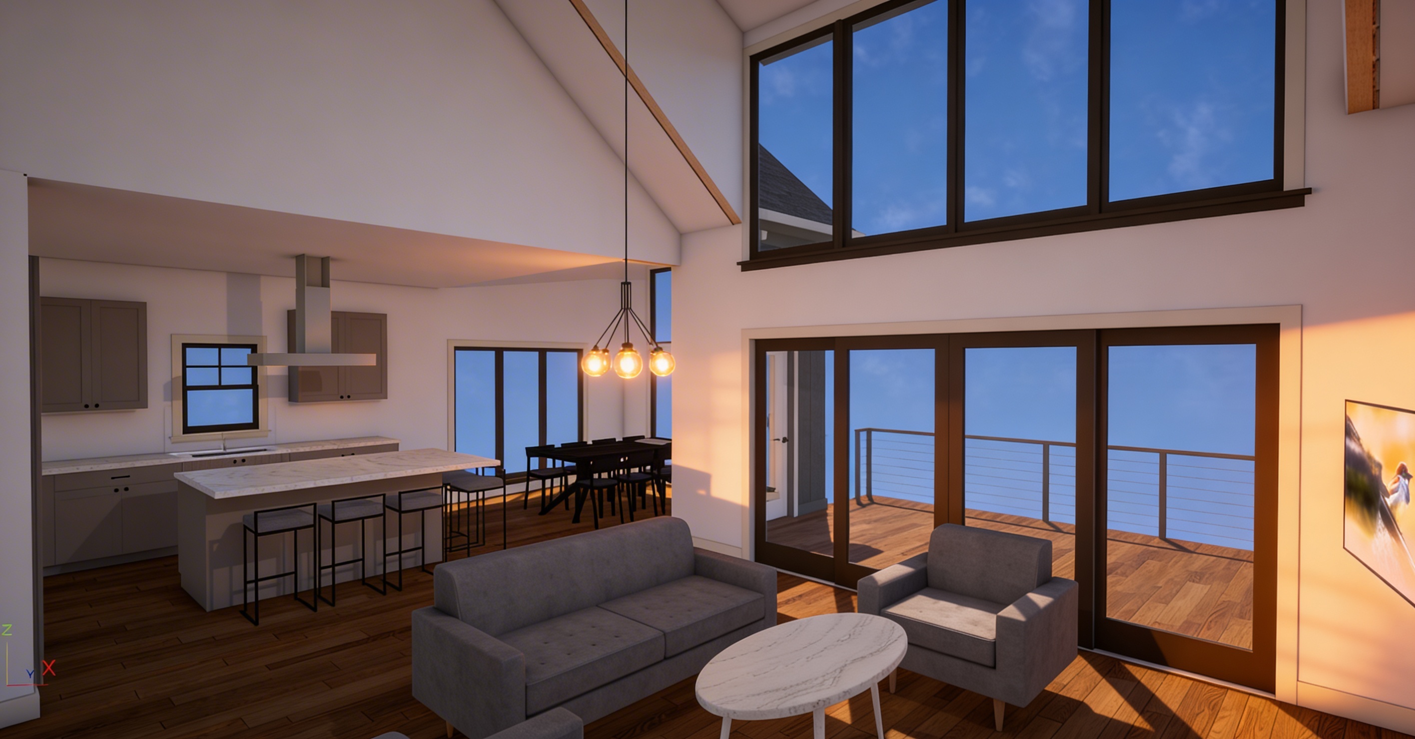 make this space feel like a vacation add nice lighting and make the space feel bright add trees right outside the back with views of a lake beyond the trees