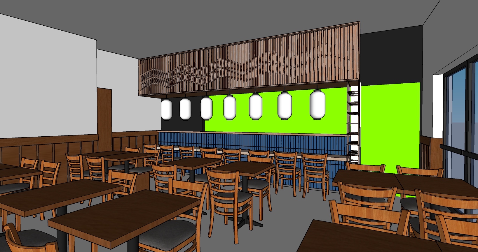 this is a tonkatsu izakaya the greenscreen in the back should be a bustling kitchen place traditional japanese plates and cups on the tables the lighting should be soft and warm evening time glow the lanterns should have japanese script on them staying in the theme of a tonkatsu izakaya place an artwork on the wall on the left the double doors to the right lead to a dark covered patio it s night time so don t render it with people
