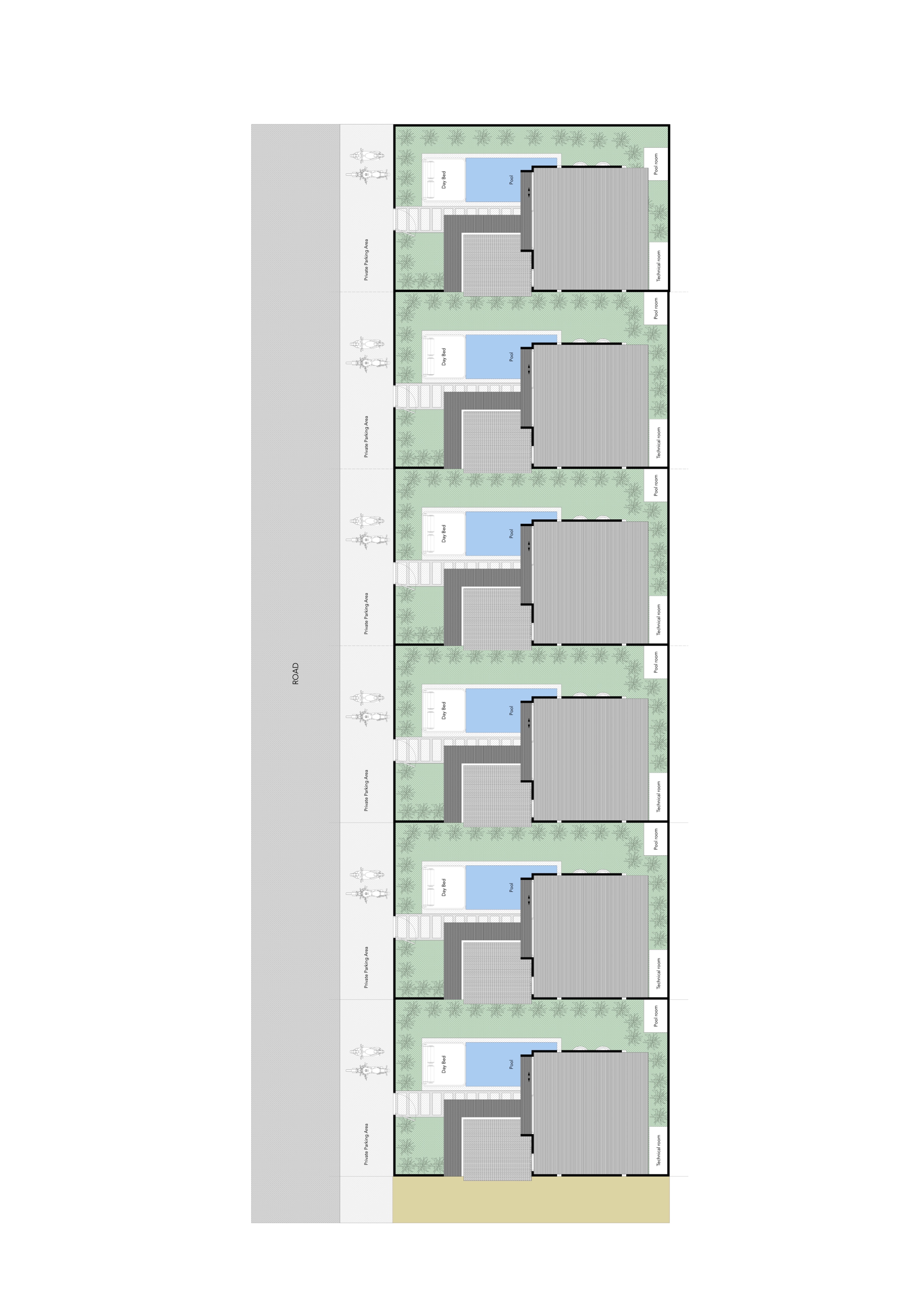 enhance this architectural masterplan top down site plan into a highly photorealistic masterplan render while strictly preserving the original drawing the result should look like a high end real estate developer masterplan with realistic materials lighting shadows and textures while remaining a top down architectural site plan view style very important this must remain a top down masterplan site plan view do not convert the image into a perspective render or aerial perspective keep the architectural plan presentation style only improve materials textures shadows and realism the result should look like a photorealistic architectural masterplan used in luxury real estate brochures layout preservation critical do not modify the layout do not move rotate mirror or flip any building or object do not change building footprints spacing or proportions the masterplan geometry must remain exactly identical to the original drawing villas roofs each villa has a single slope roof the roof must be one continuous plane sloping downward toward the right side of the image roofs should be rendered in dark grey metal sheet roofing with a subtle realistic metal texture do not change the roof shapes only apply materials sun decks the sun decks must contain outdoor daybeds not sun loungers a daybed is a wide rectangular outdoor mattress platform designed for lying or sitting not a reclining chair use light beige cushions with a natural wood base keep the exact size and position shown in the plan road the road bordering the plot must be rendered in light concrete use a realistic concrete texture with subtle variation parking area parking areas should be simple light concrete flooring do not place any cars in the parking area the parking should remain clean and minimal with no vehicles technical area the technical area must remain brown render it as a utility surface such as compacted gravel or service ground surrounding vegetation vegetation should be mainly outside the plot boundaries surround the plot with dense tropical vegetation palms tropical trees jungle plants landscaping inside the plot should remain minimal so the architecture stays readable material palette concrete light grey matte concrete roofs dark grey metal sheet daybeds beige cushions with wood base road light concrete technical area brown service ground realism use highly realistic textures and subtle shadows apply natural lighting and soft shading the result should feel like a photorealistic architectural masterplan not a sketch or illustration goal create a luxury real estate masterplan render while strictly preserving the architectural layout no layout changes no geometry modifications no perspective rendering only material realism and visual enhancement