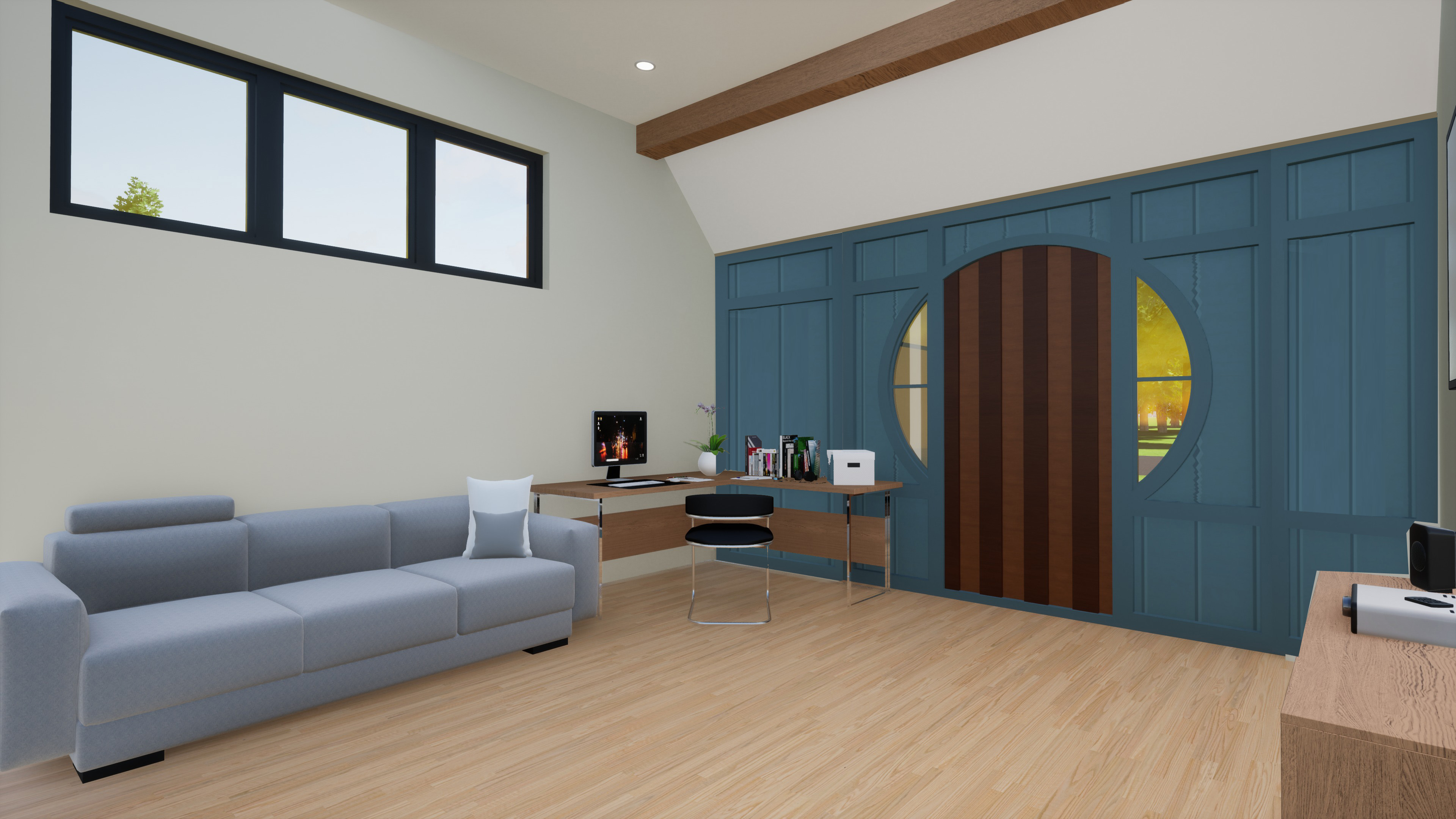 make floor darker make desk a drafting table ad coffee table in room and put stratocaster on the wall
