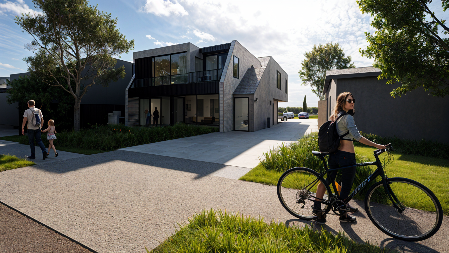 floors are concrete matte finish add daylight filling space from windows blend with ambient light celing is white time of day is golden hour change color of sofa to mauve change yellow to pine wood ceiling is white change yellow to pine blue bar stools are eames increase natural light in space counter tops are concrete blend recessed lights with natural light
