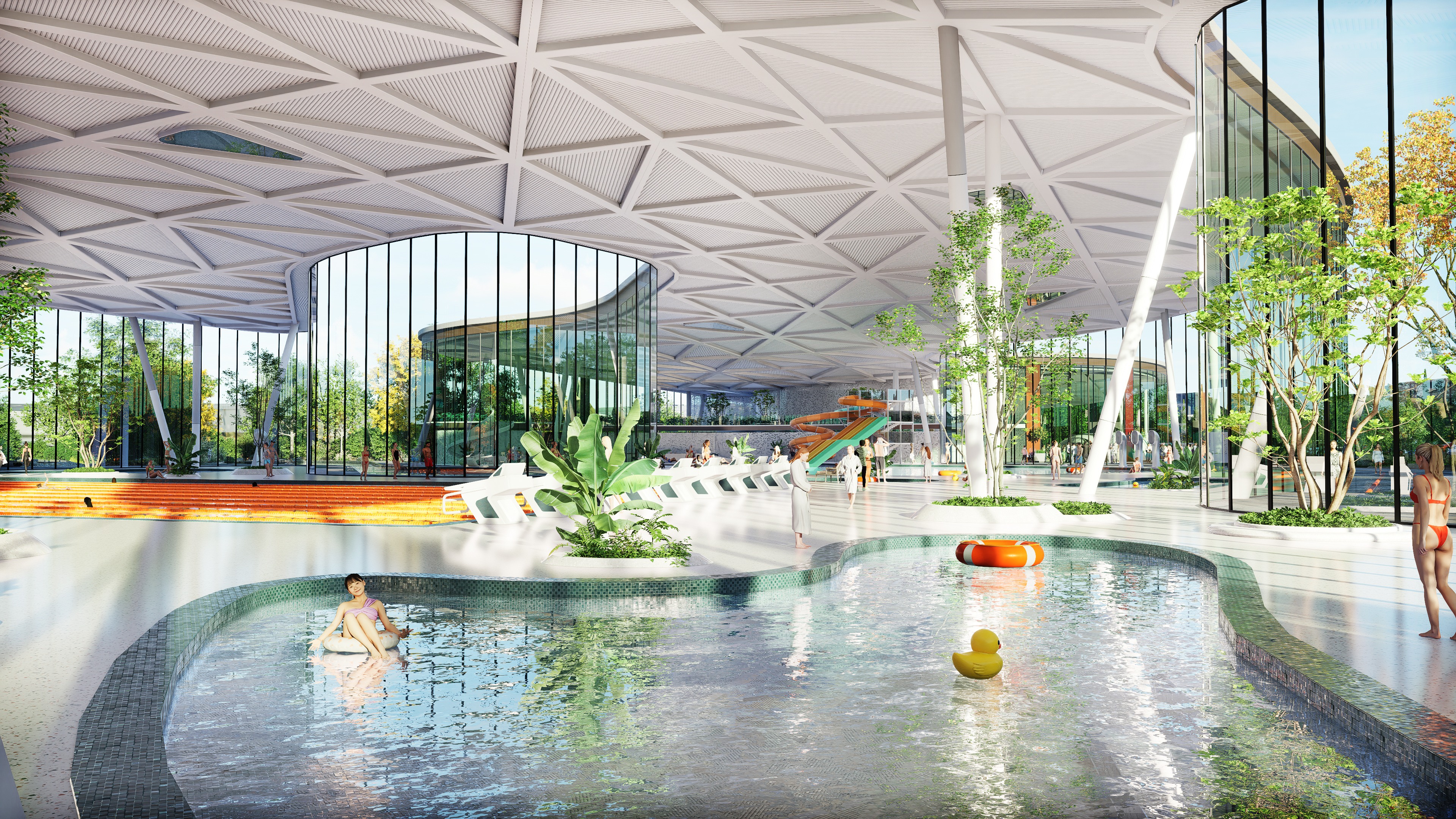 important preserve the existing geometry and the existing context exactly as provided preserve the existing windows do not add new windows do not modify alter reinterpret add remove scale or reshape any geometry do not change the site surroundings street layout neighboring buildings vegetation or context elements do not modify geometry scale proportions buildings road layout sidewalks or surrounding context in any way do not modify text soft sunny noon atmosphere diffused neutral natural daylight with subtle tones cinematic architectural mood weak interior lighting 4000k slight glowing from inside large glass surfaces with realistic reflections soft mirror effect environmental reflections of sky and surroundings important do not add new windows remove the people