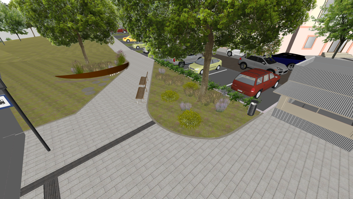 ultra realistic architectural visualization based strictly on the provided raw sketchup view preserve exact geometry proportions camera angle composition and architectural details do not redesign or alter the building enhance only with realism add realistic materials with physically accurate textures natural wood grain brushed concrete glass reflections subtle imperfections micro surface details use high dynamic range lighting with soft global illumination and realistic shadows create a lively atmosphere enhance environment with greenery slight wind in trees varied vegetation tones small urban details parked cars benches subtle signage add depth with atmospheric perspective and realistic sky conditions golden hour soft overcast choose whichever enhances the mood cinematic composition photorealistic rendering 8k detail realistic depth of field natural color grading slightly warm tones architectural photography style shot on full frame camera 35mm lens maintain realism over stylization avoid cartoonish or ai looking artifacts the round brown texture under the tree trunk is smooth round piece of corten