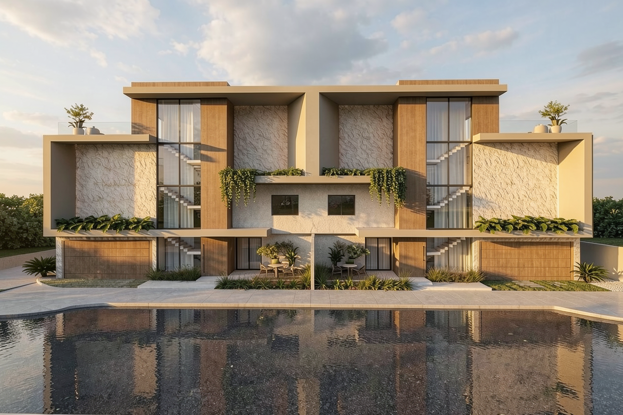ultra photorealistic modern house facade 3 story contemporary architecture frontal view full facade composition as main focus clean volumes in black dark gray and off white vertical wooden slats large floor to ceiling glass windows warm integrated led lighting in facade lines and soffits realistic materials matte stucco natural wood opaque glass metal details wet pavement with subtle reflections afternoon lightning cinematic but natural sheer white linen curtains semi transparent soft folds low opacity matte fabric subtle presence not dominant not glossy not metallic eye level shot 35mm lens architectural photography slight perspective correction global illumination realistic shadows soft warm interior light cool exterior ambient light