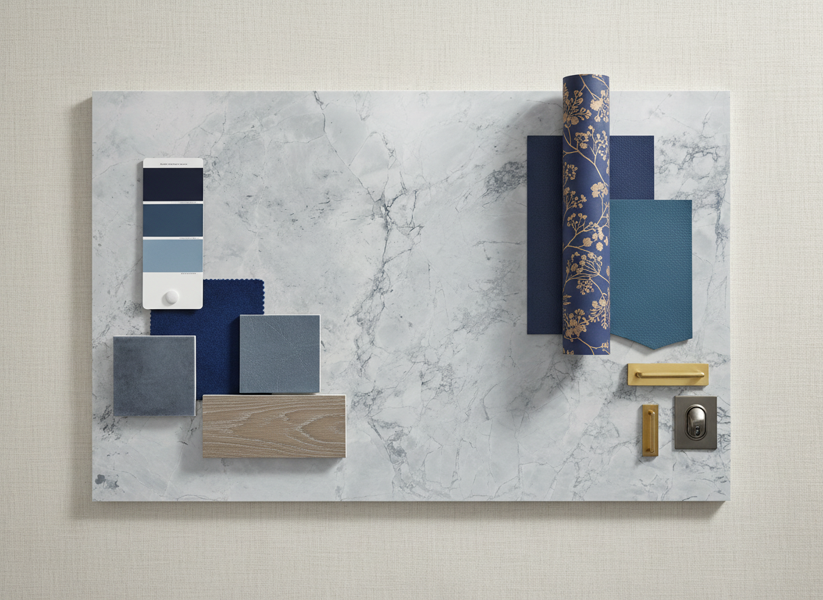 render a high end transitional living room from the moodboard featuring a slab of grey goose marble as the fireplace show any light fixtures as illuminated and add warm sunlight from nearby windows ensure there are several plants around the space and staged with luxury decor include wallpaper in the architectural elements grey goose marble has a medium grey background with think dark grey veins