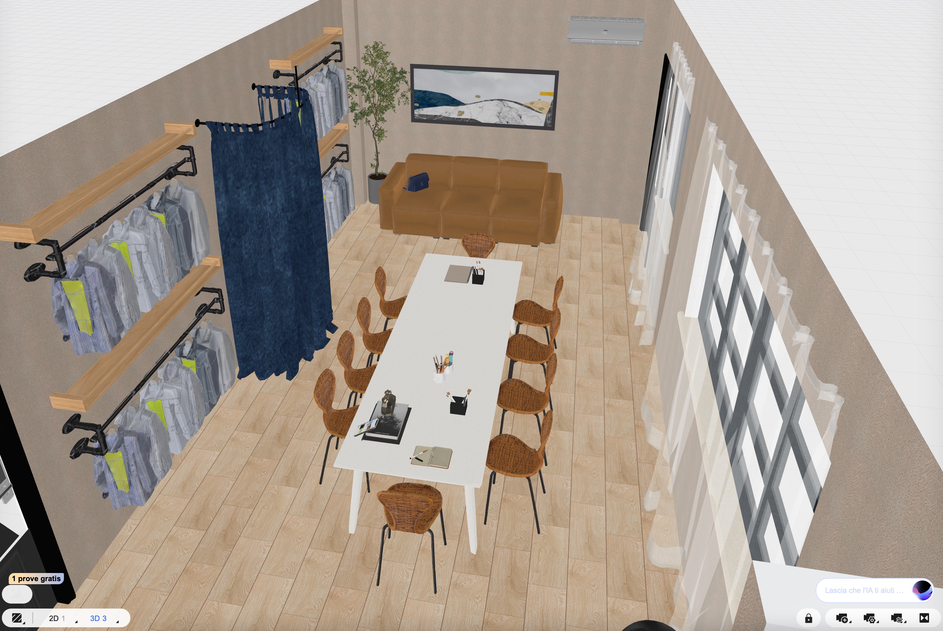 create a realistic effect of a sample room meeting space for a clothing company let the light naturally enter through the windows the sofa and armchair are the same brown leather color as the classic italian sofas from the 1970shigh end interior design hyper realistic textures 8k resolution cinematic lighting minimalist aesthetic sharp focus leave the color of the window frames dark gray