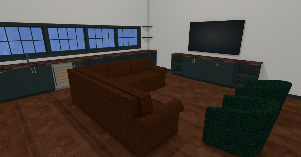 ultra realistic photograph of a modern private club room interior upscale lounge atmosphere rich dark wood flooring with natural grain deep green built in cabinetry with brass hardware warm walnut countertops large horizontal industrial style windows soft daylight entering at dusk plush brown leather sectional sofa with realistic texture and subtle creasing deep emerald green upholstered lounge chair wall mounted flat screen tv above custom cabinetry integrated wine fridge minimalist wall sconces with soft indirect lighting cinematic lighting balanced warm and cool tones realistic shadows accurate reflections depth of field professional interior photography shot on full frame dslr 35mm lens f 2 8 hdr global illumination ray traced lighting ultra high resolution sharp focus natural color grading luxury members only club aesthetic
