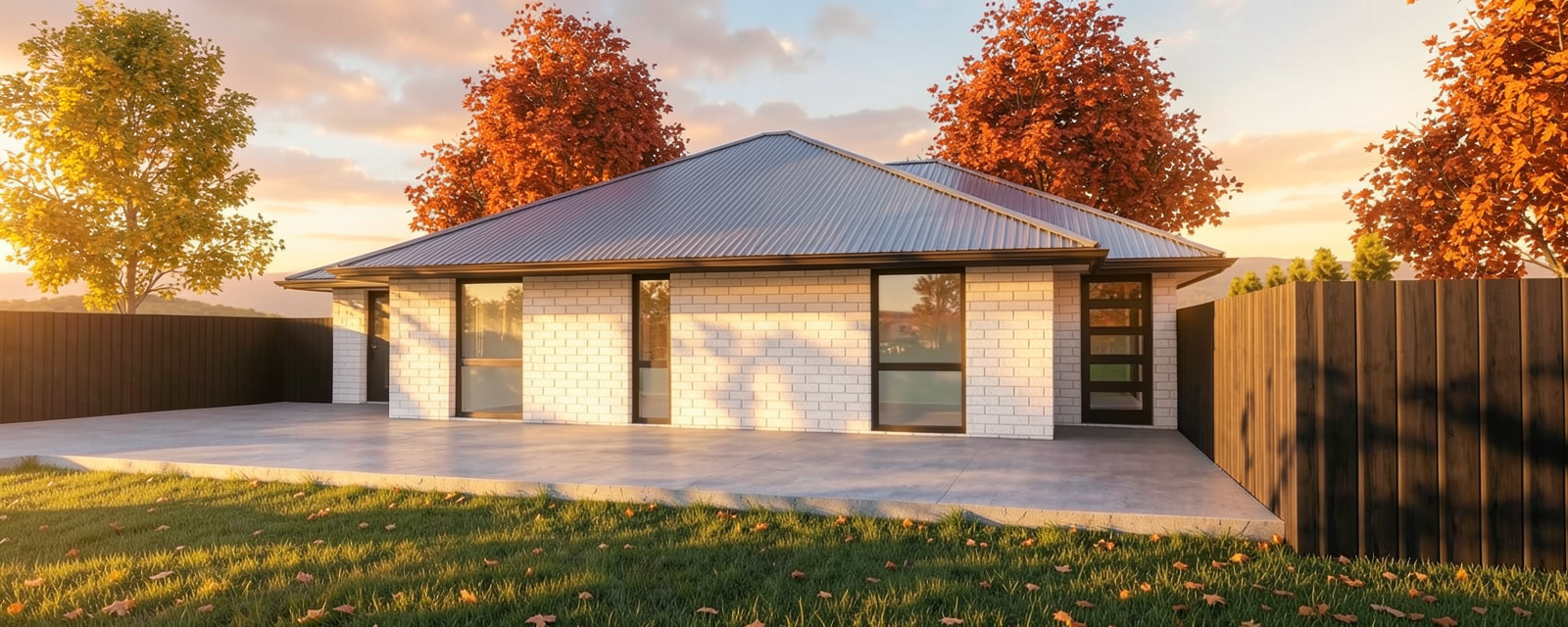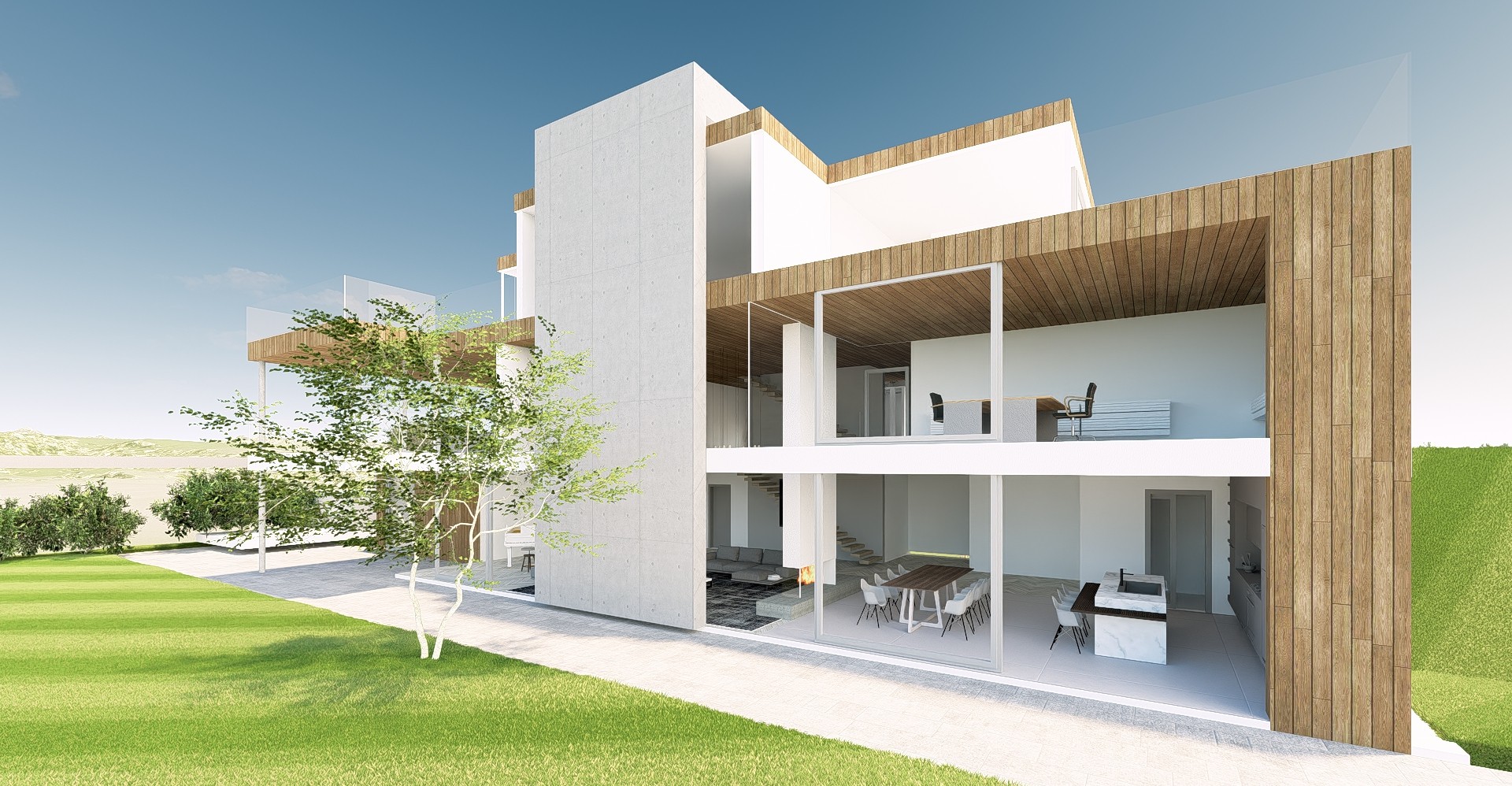 night wiev ad one spot light under the tree add some plants to the lawn area add one person outside add open curtains on the first floor letting light from the rooms out