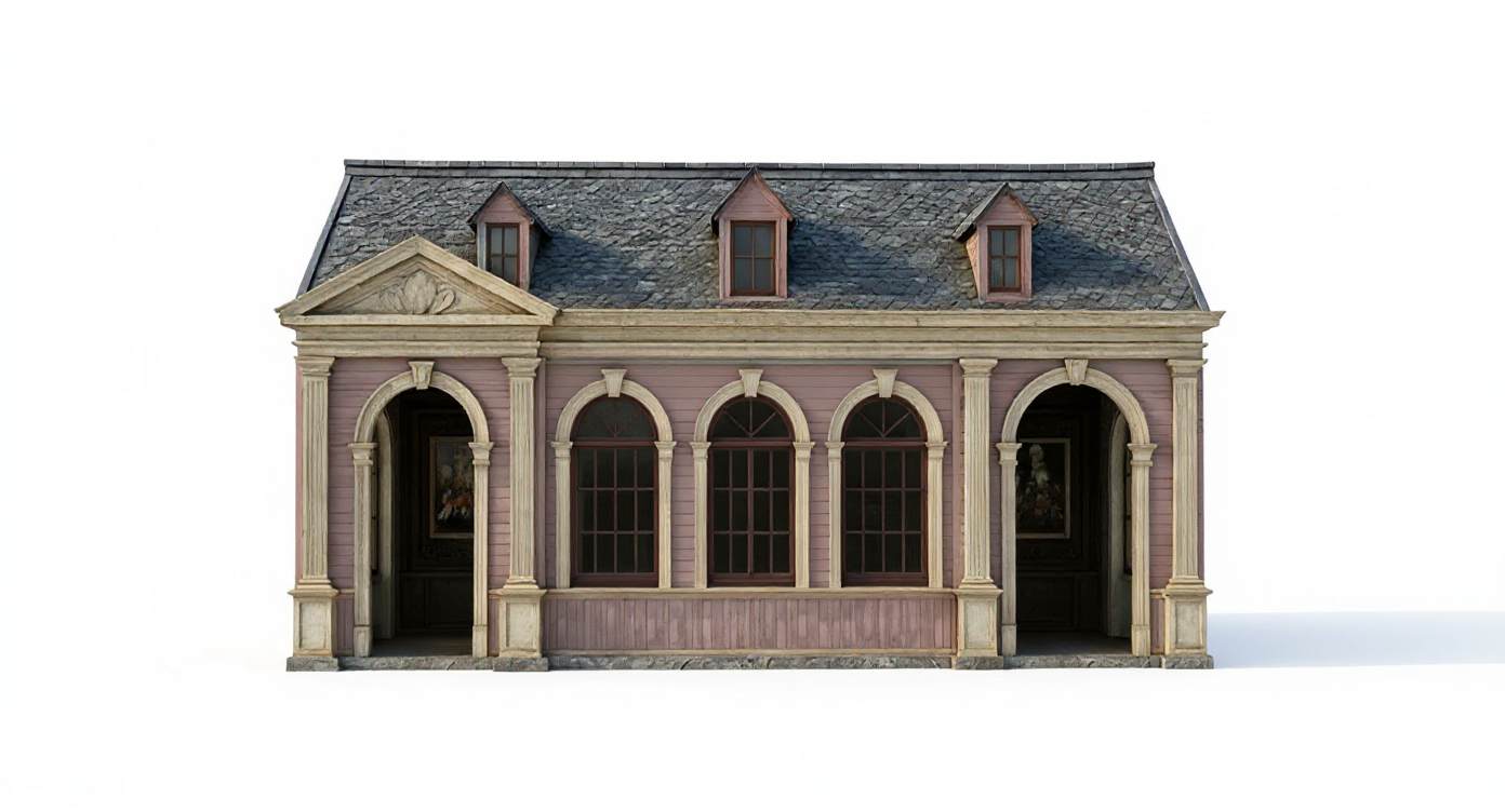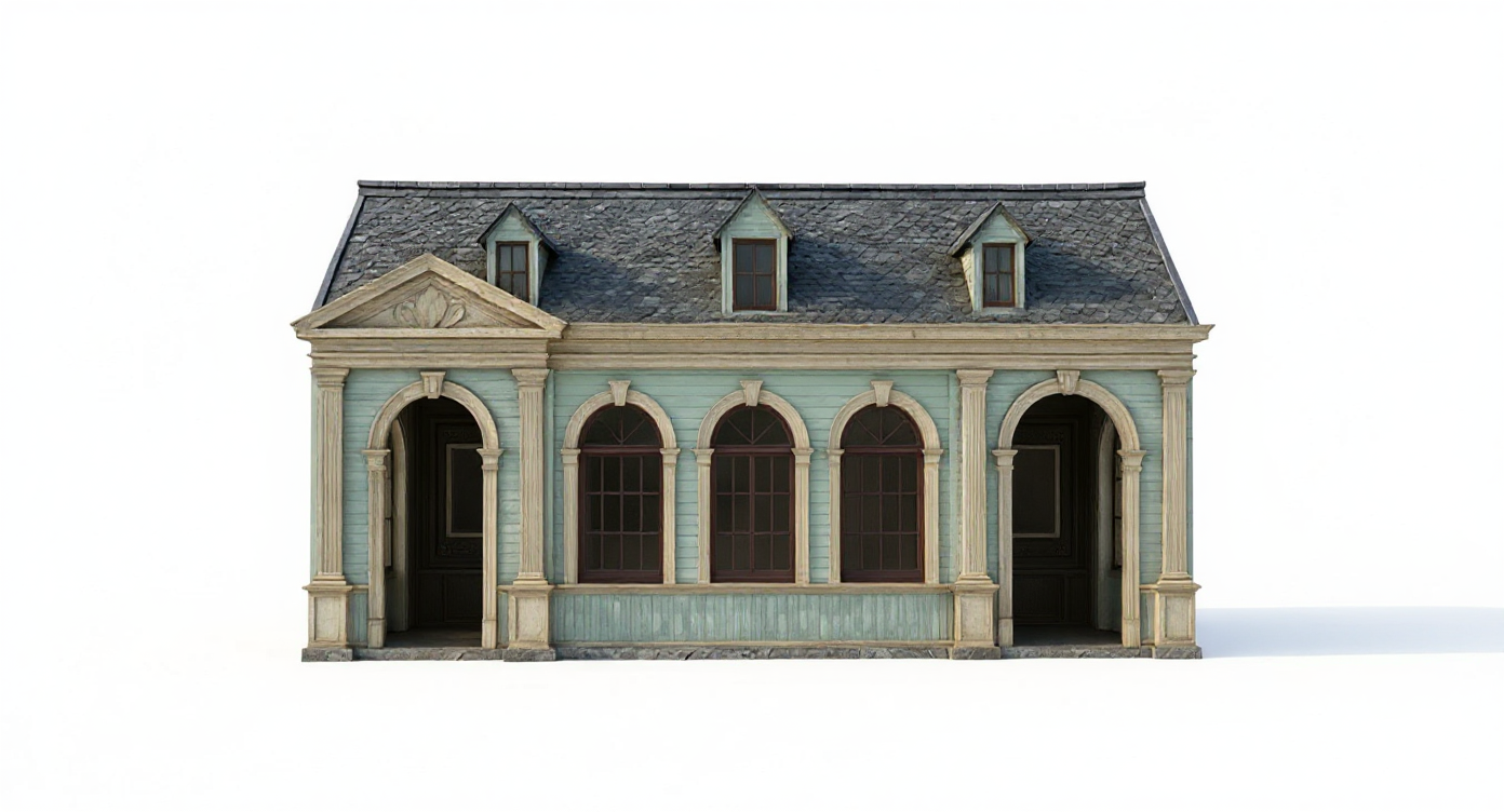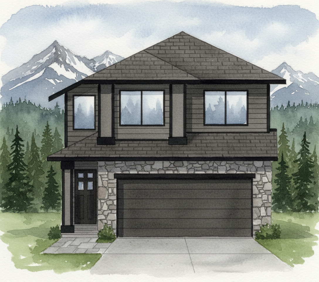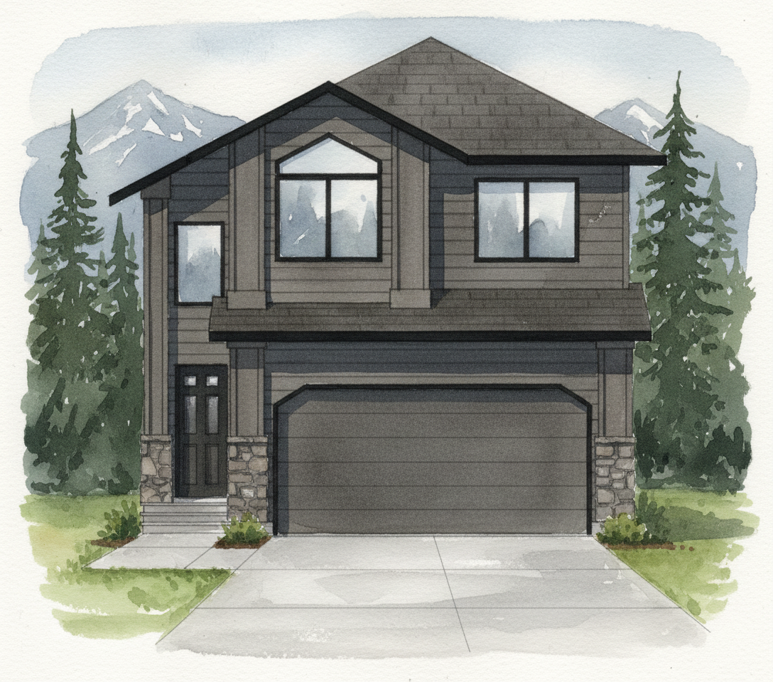 watercolor render of modern home with blue paint and white trim include trees and an alaska like environment in the background simple driveway and walkways in front of the home