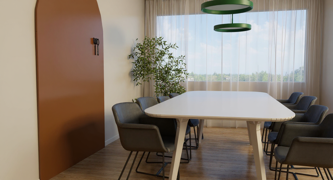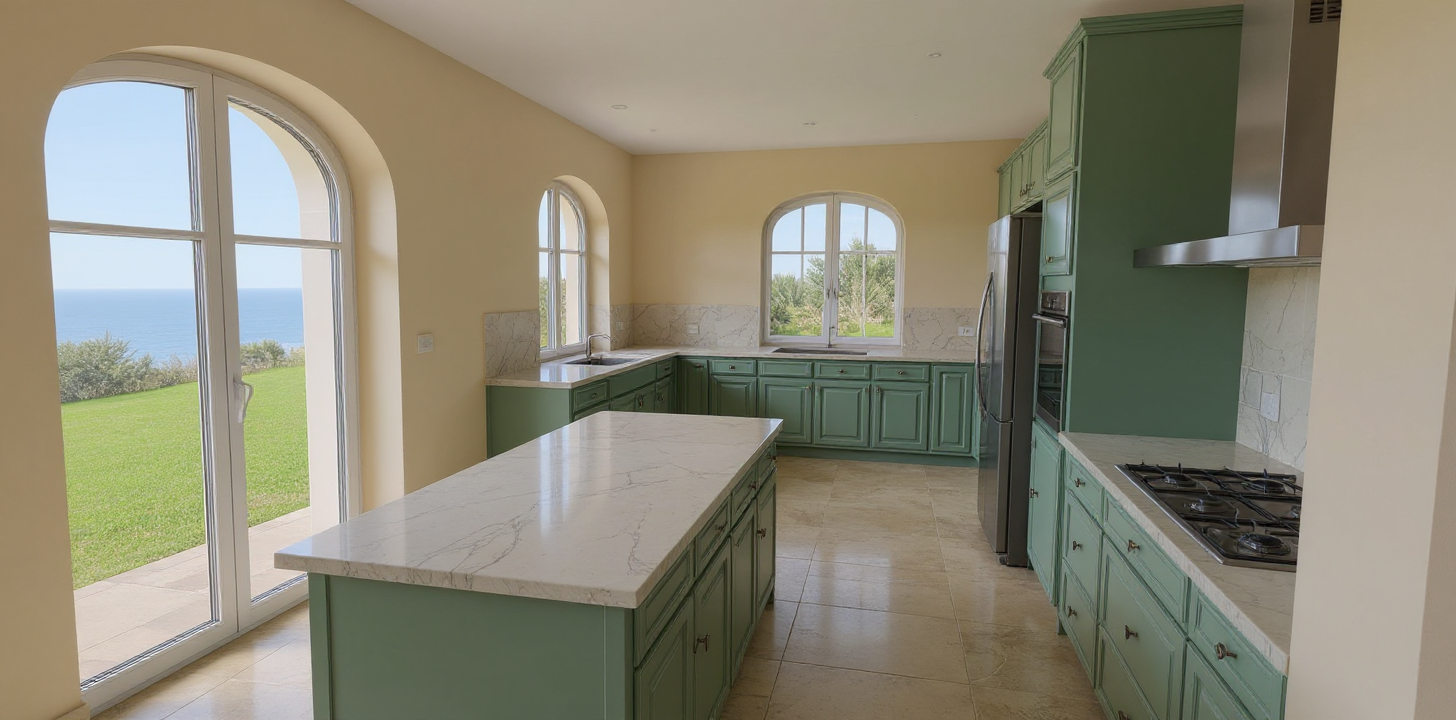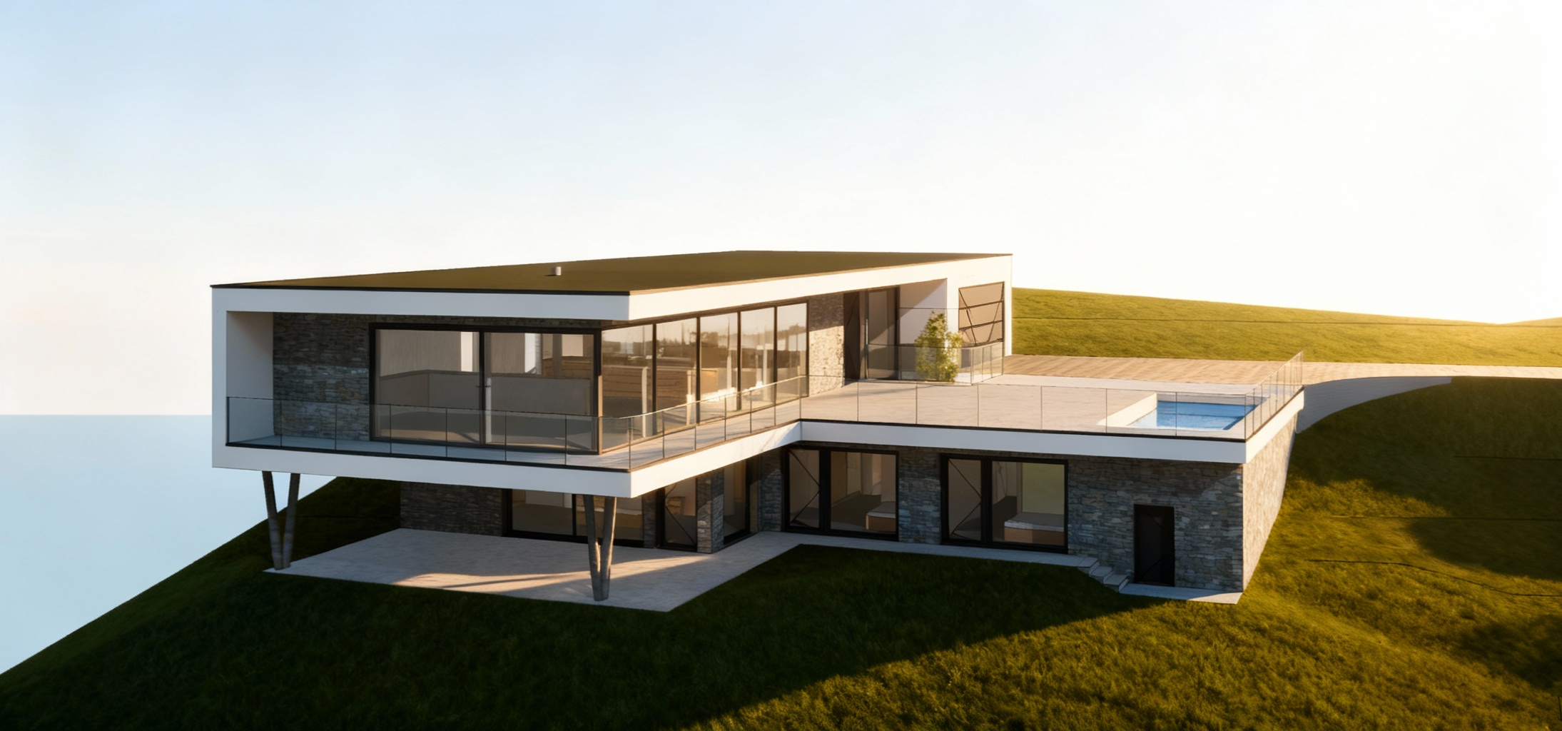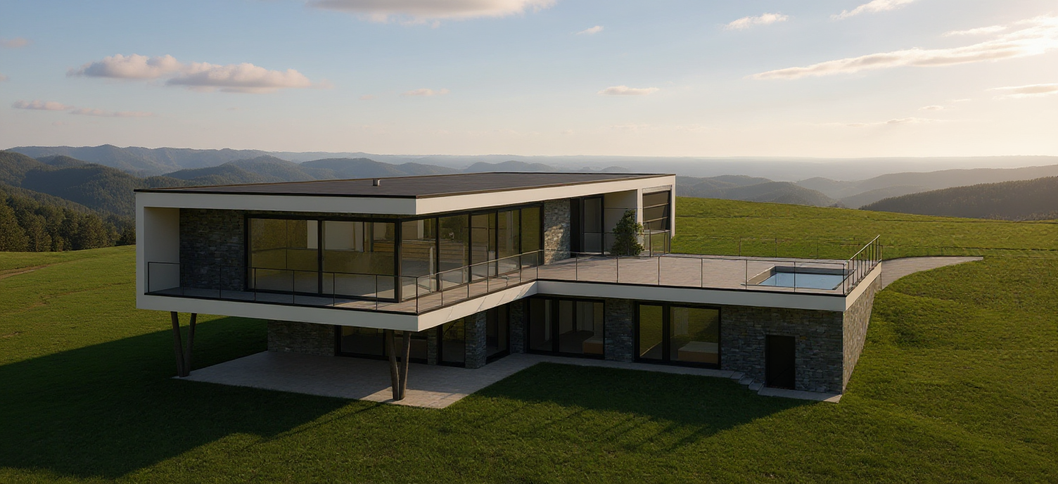 keep the same aerial view of a modern suburban neighborhood featuring rows of minimalist white and grey plaster houses with flat gray bitumen roofs and len to without wall next to it some of the roofs have solar panels installed the houses are neatly aligned each surrounded by lush green lawns and separated by elegant red boundary lines change red line to dark grey metal wire fences building height scots pine line the gray asphalt roads and grey walkways in both sides of the road adding a natural touch to the geometric layout there are no trees in the borders of the picture the scene is bathed in soft warm sunlight creating a serene and harmonious atmosphere
