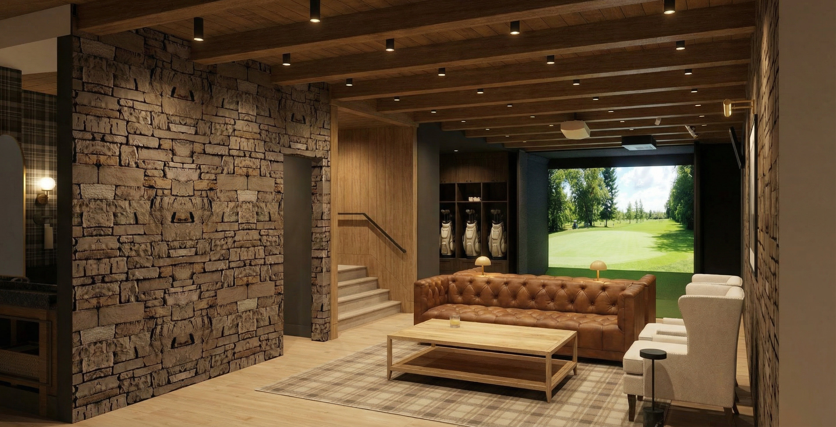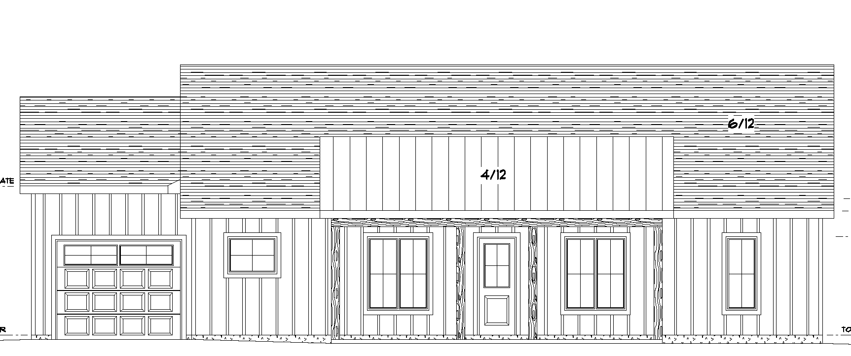 taupe siding brown shingles black windows black garage door roof over the front door is a shed roof garage door has windows on the top row