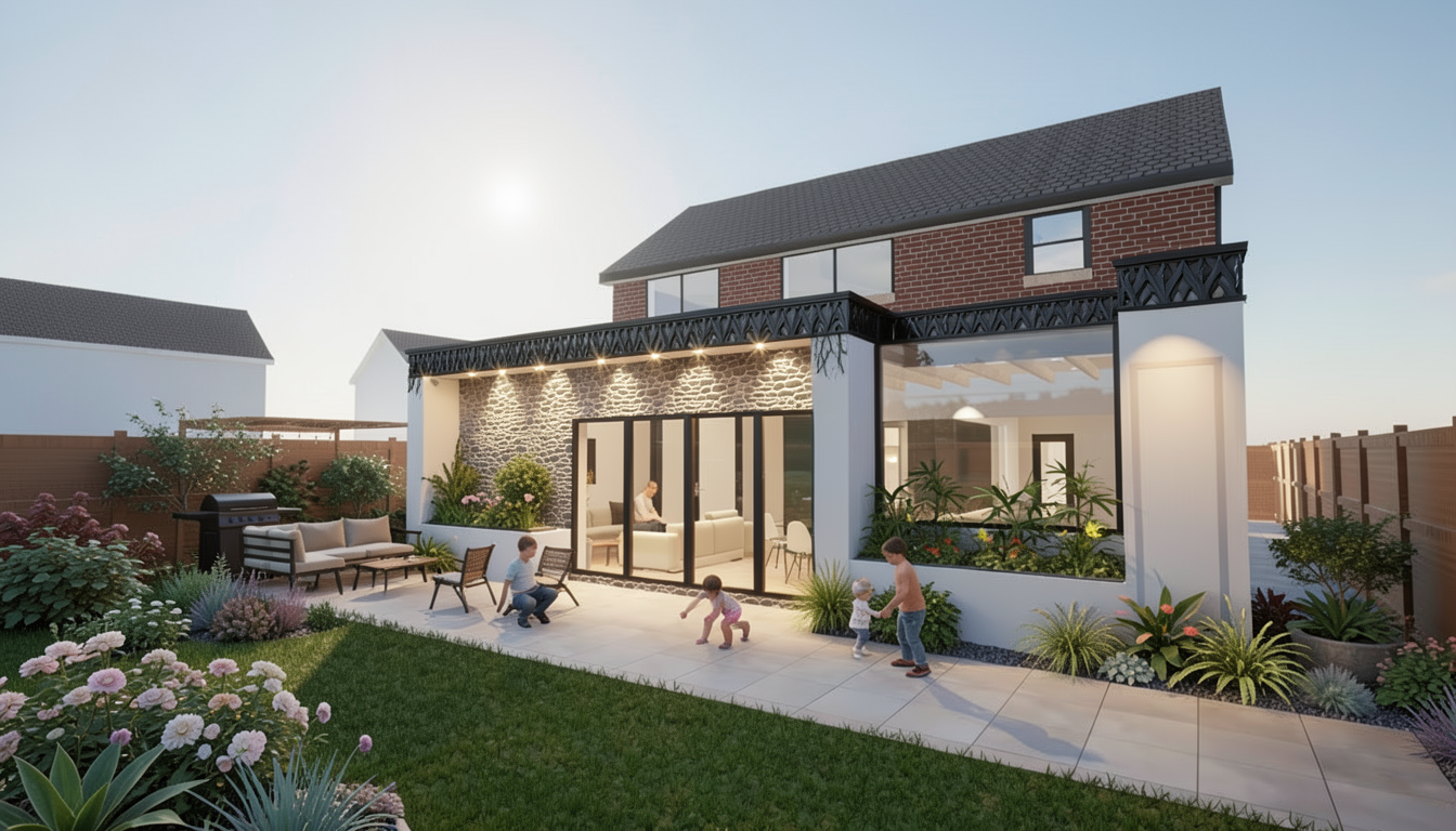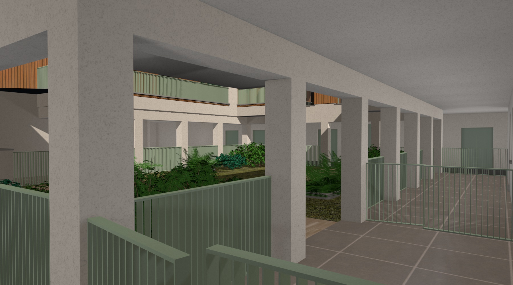 metti una ambientazione estiva con una luce solare di una bella giornata metti un faretto a muro ad ogni colonna del portico e rendi pi elegante il verde e il giardino interno