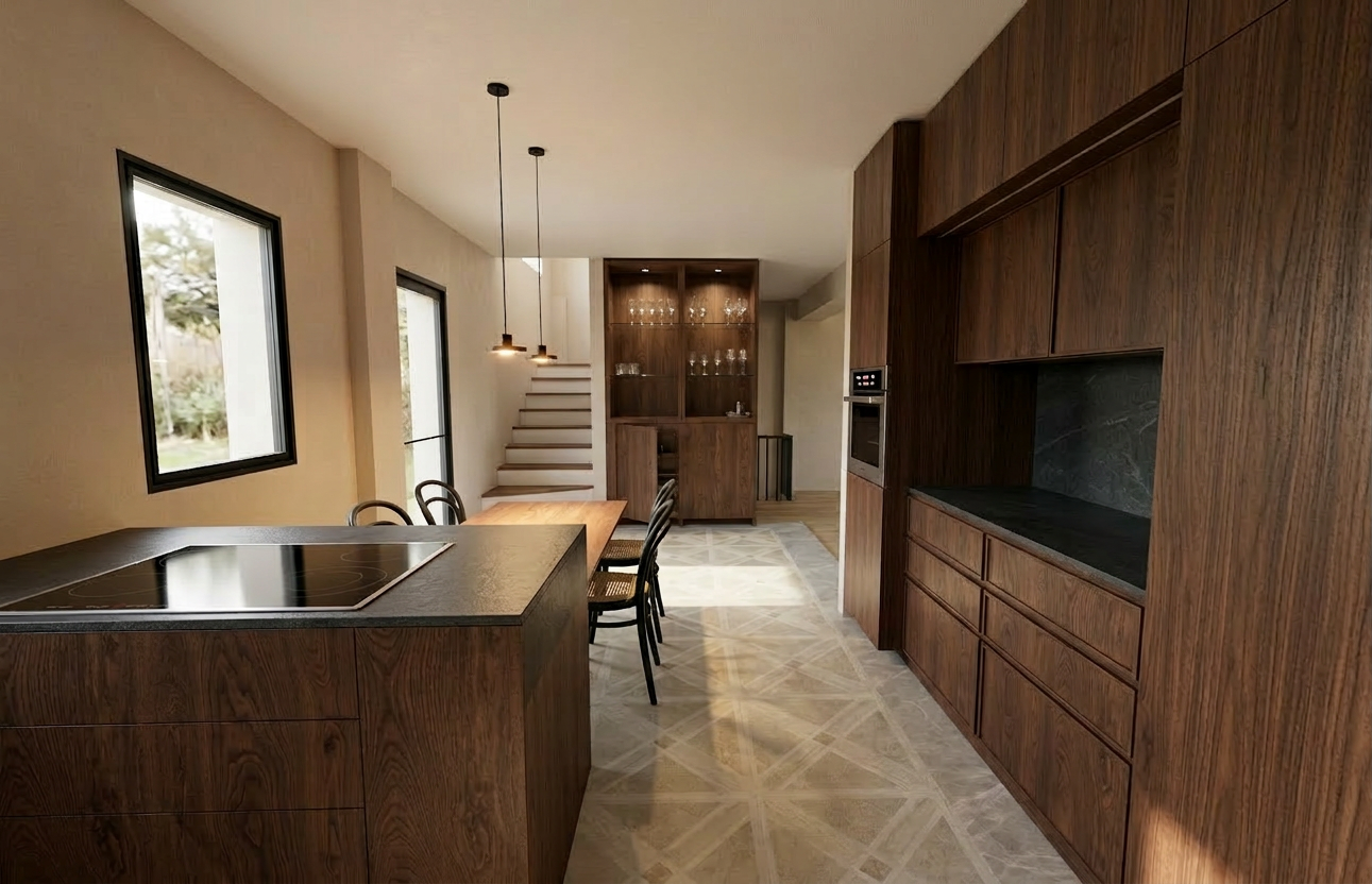 modern interior shot modern kitchen beige walls white ceiling add kitchen accessoires keep room proportion and windows like it is architecture