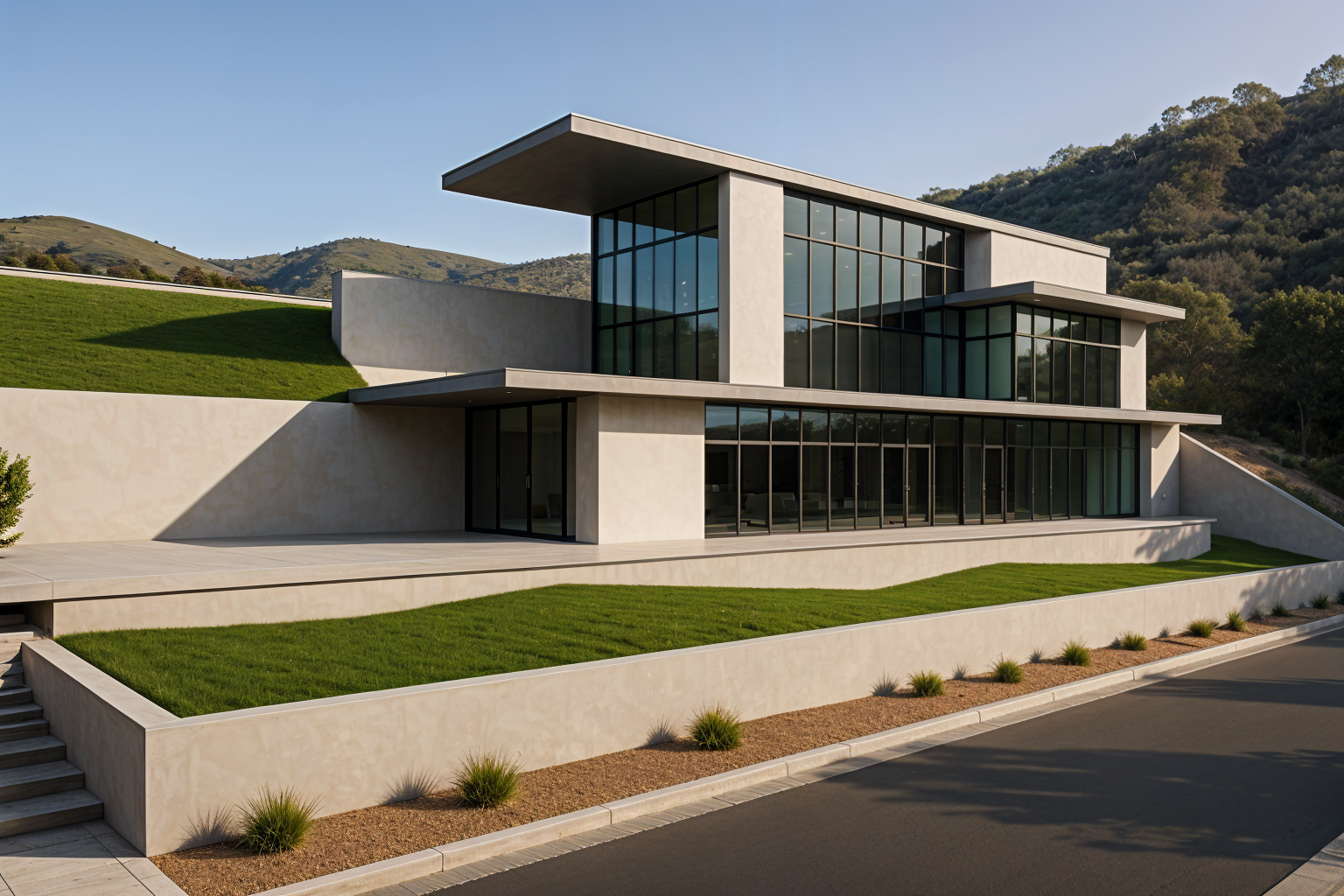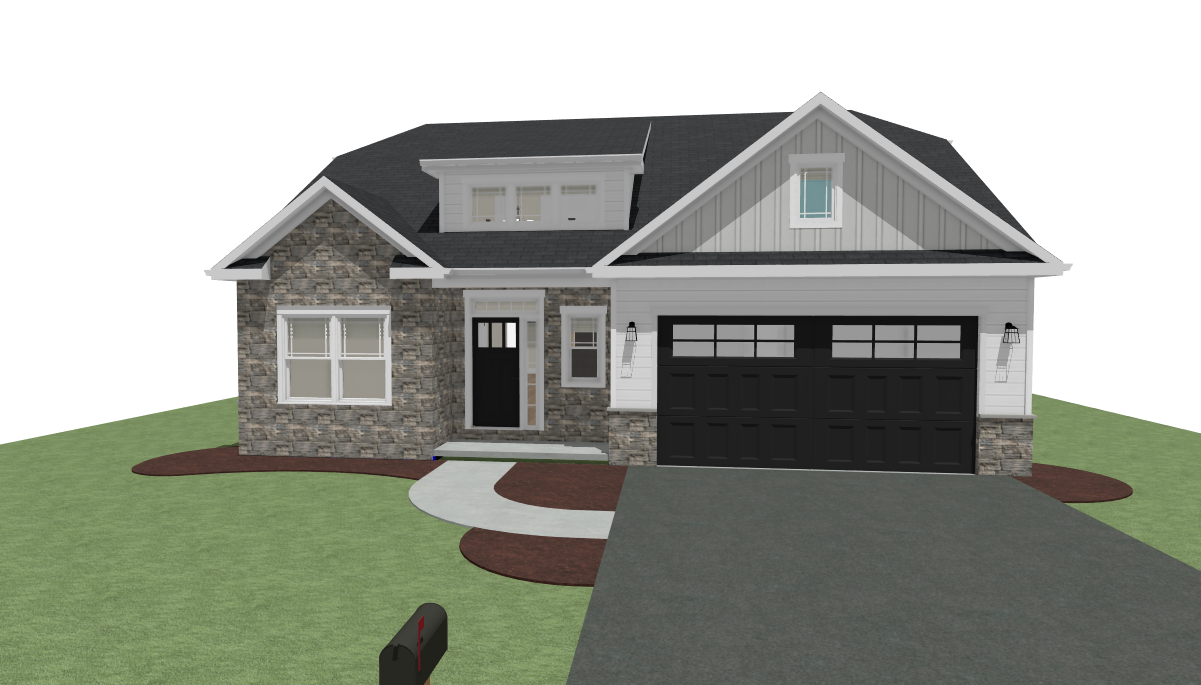 render this 3d image to appear photo realistic maintain all existing architectural materials and structural elements exactly as shown enhance the setting with a lush well maintained landscape include minimal beds manicured shrubs and a tree lined backdrop that frames the home naturally the windows should have a glossy finish with clear reflections of the surrounding trees and sky lighting should feel natural with soft shadows and realistic depth to bring the scene to life