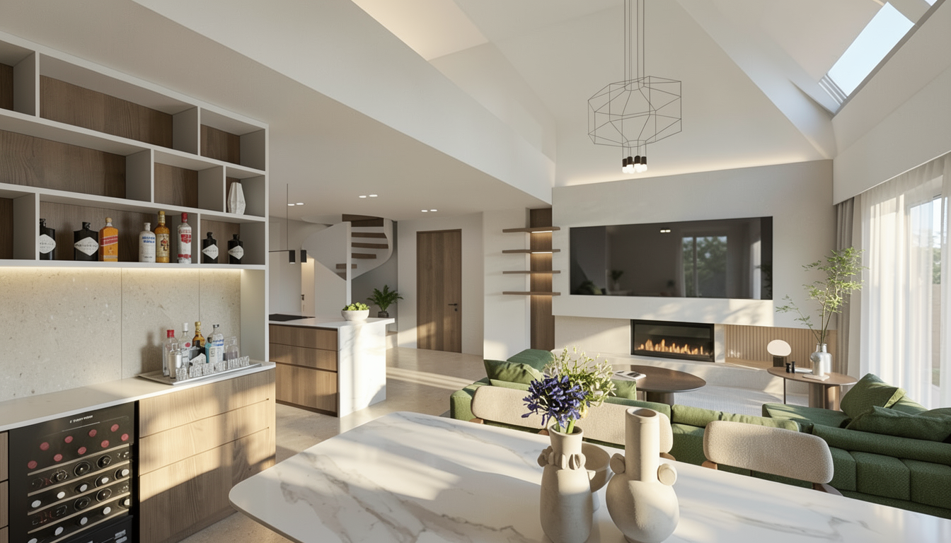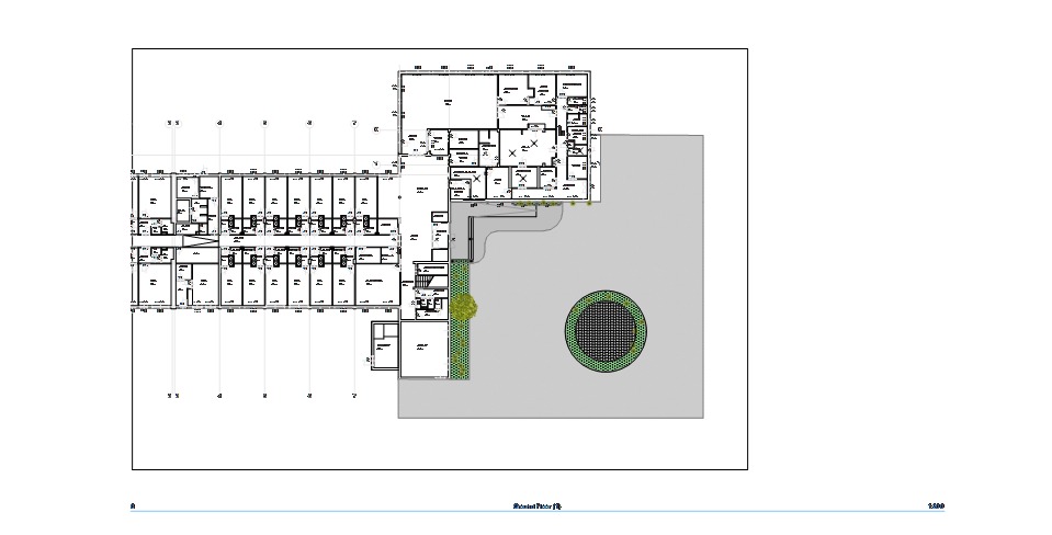 top down architectural floor plan 2d technical drawing black and white line art generate a layout based on the building in the image a multi story rectangular main building with a prominent s curved cantilevered entrance canopy on the right side include the driveway and the surrounding landscaping professional cad aesthetic clean lines high detail