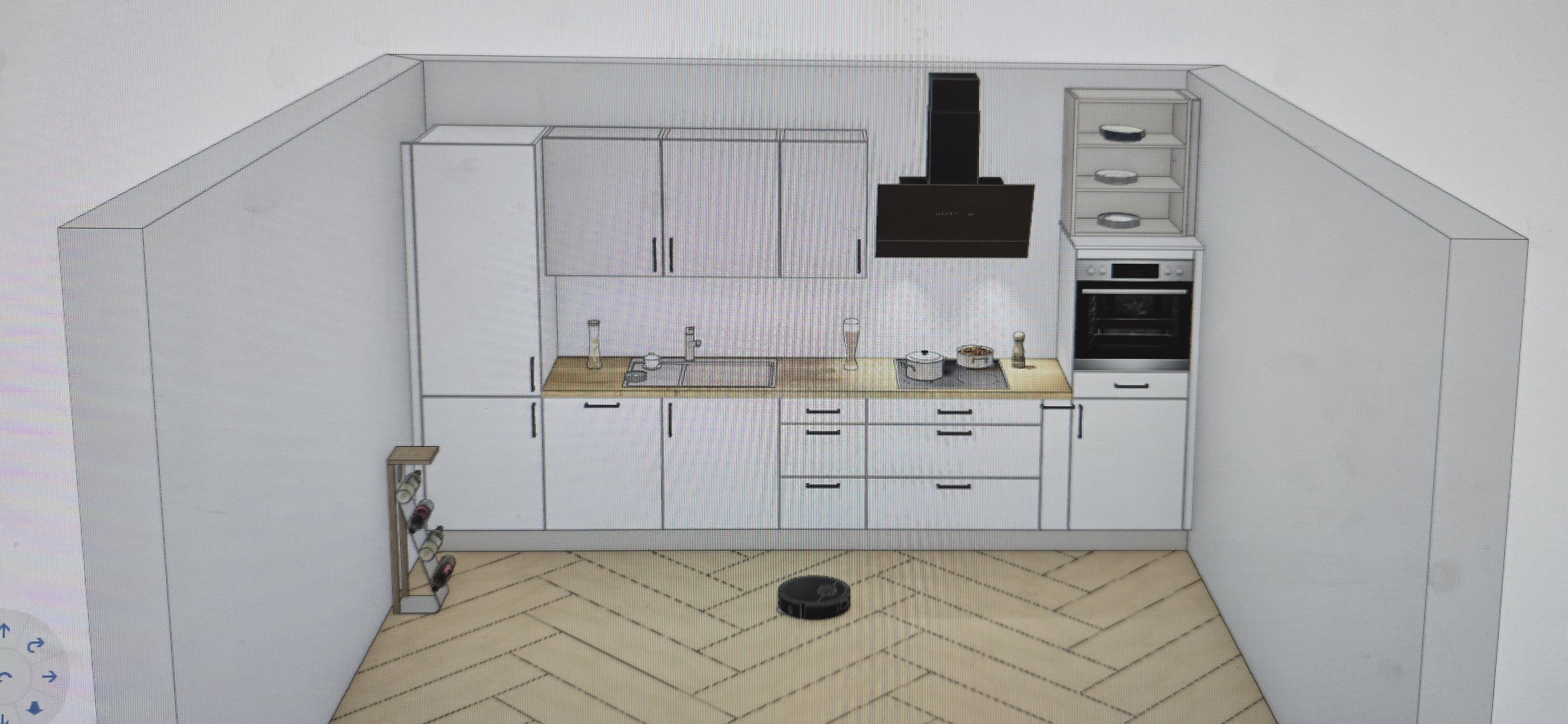 a beautifully rendered modern kitchen with a minimalist design the cabinets are sleek and glossy white reflecting natural light paired with stainless steel handles the countertop is a warm light oak wood that adds a touch of natural elegance the backsplash is a subtle marble texture in soft gray and white tones seamlessly integrated the kitchen hood is matte black providing a bold contrast while the oven is a polished silver and black creating a harmonious tech inspired look the flooring is a light herringbone wooden pattern that complements the countertop there is a small stylish wine rack on the left made from stainless steel and wood displaying elegant wine bottles the atmosphere is warm and inviting with soft ambient lighting enhancing the modern aesthetic creating a cozy yet modern space