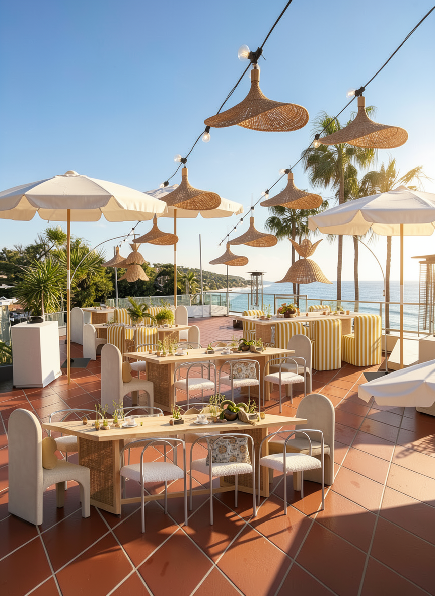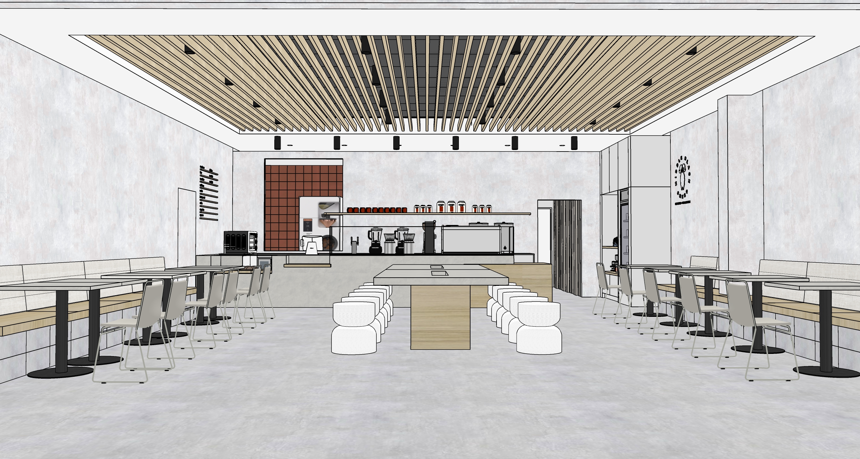 a minimalist contemporary caf coffee bar interior with a calm gallery like feel the design is very clean and linear with a strong sense of symmetry centered on the service counter and communal table the palette is restrained and mostly monochromatic soft whites light grays black accents and pale natural oak while the muted terracotta tile at the back bar adds a warm focal moment the long wood slat ceiling gives the space rhythm direction and warmth while the polished concrete floor and simple wall finish keep it modern and understated built in banquette seating along both side walls makes the room feel structured and efficient and the central communal table with low stools reinforces a social casual caf atmosphere overall it feels japanese inspired modern quiet refined and functional